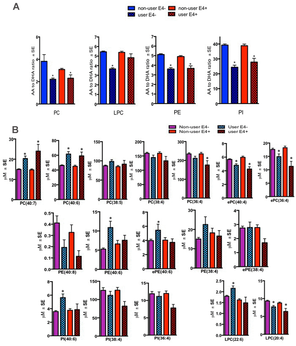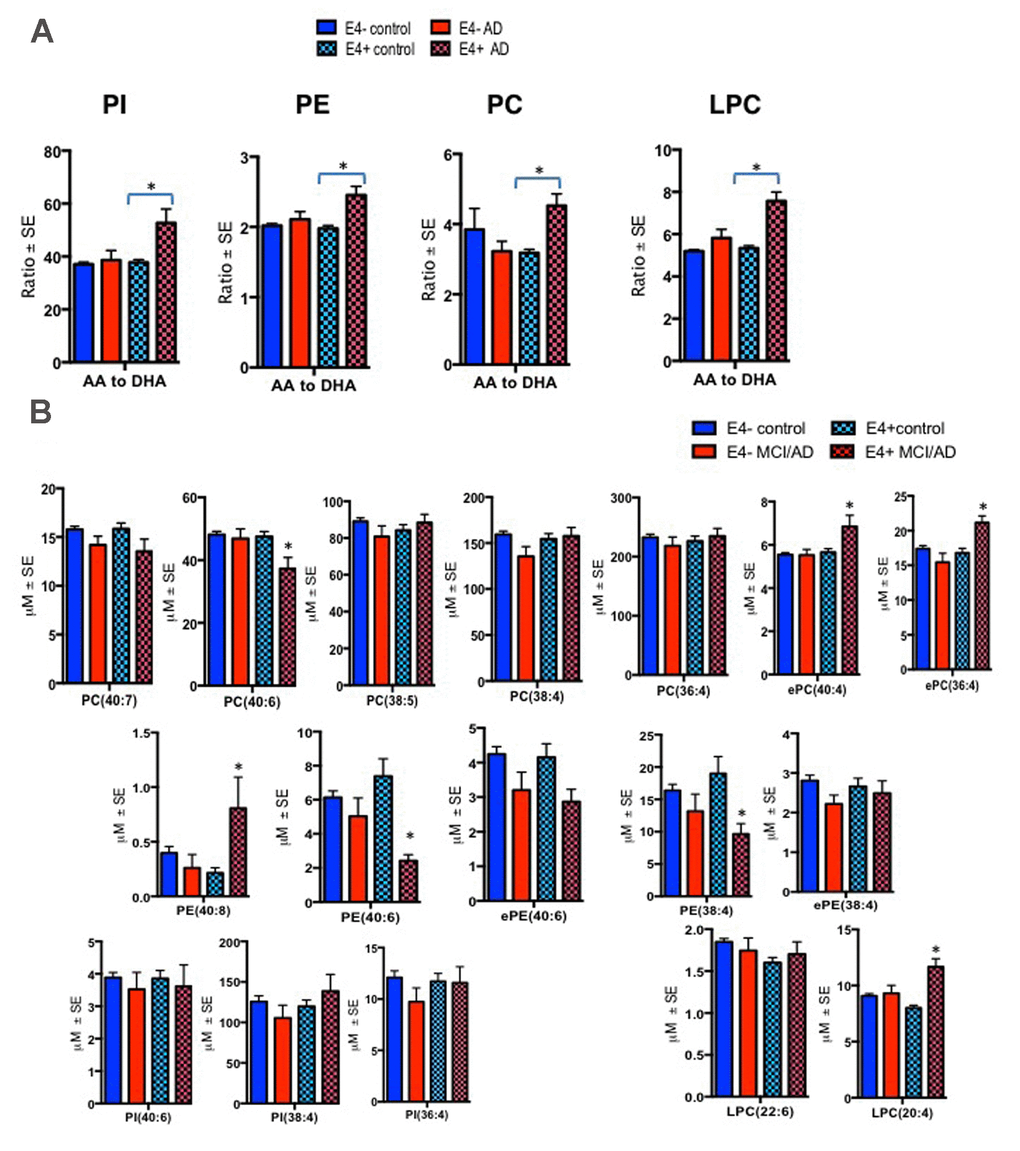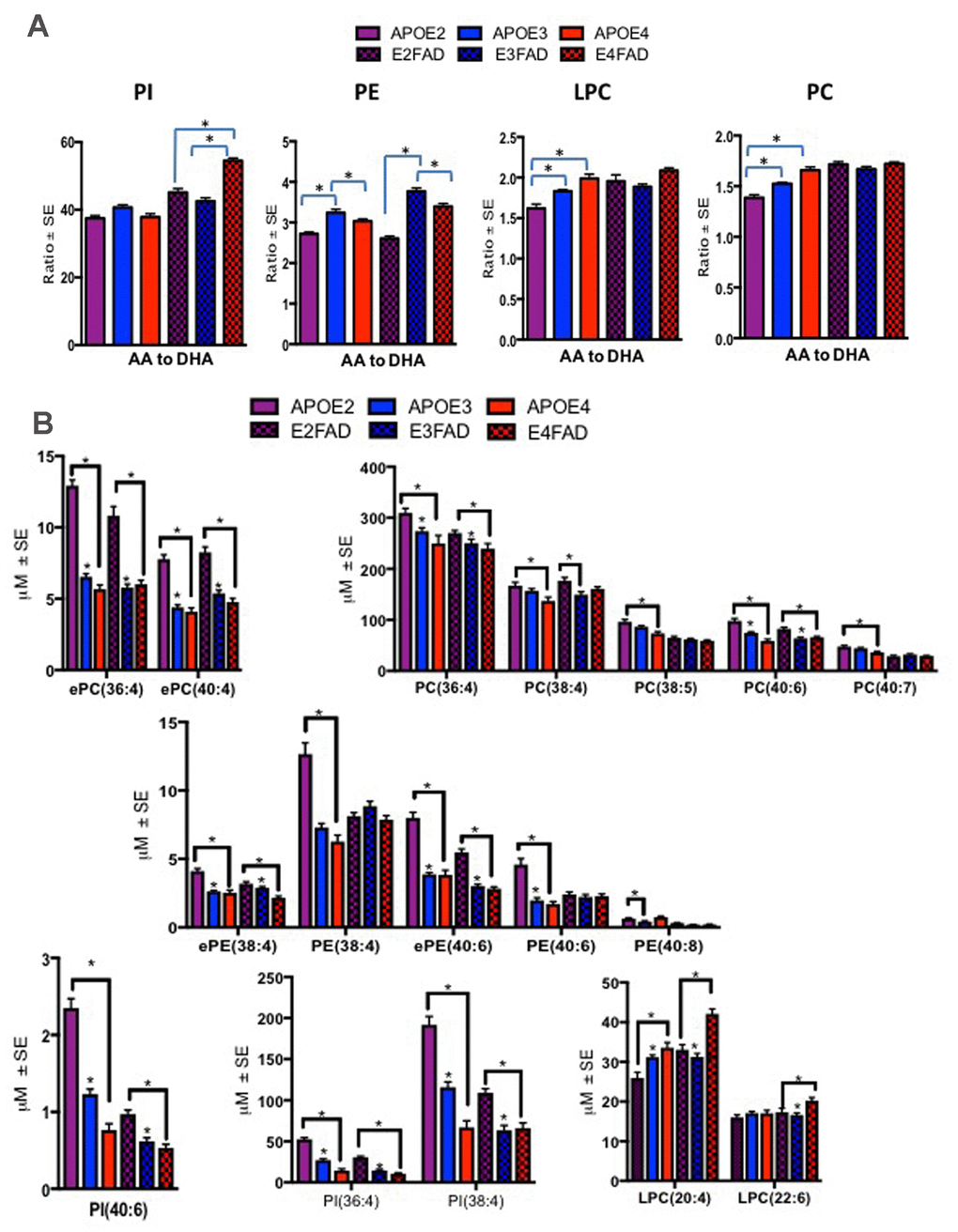 An increase in AA to DHA ratios was observed in several PL classes in mice harboring APOE4 relative to other APOE isoforms