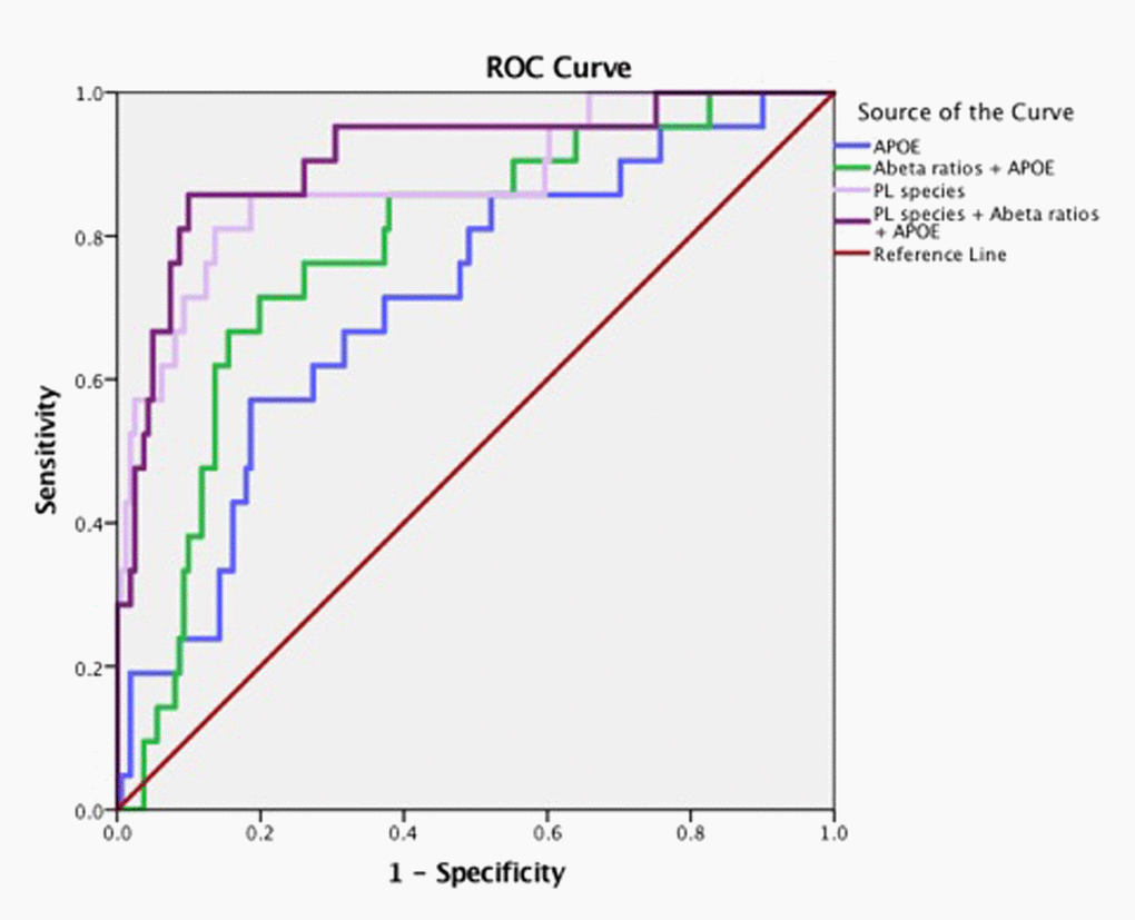 In the present studies, we show an interaction between the ε4 status and high AA to DHA ratios with the risk of developing MCI/AD. We also demonstrate that combining the APOE genotypes, blood AA and DHA species and the Aβ42/Aβ40 ratio improves the accuracy for detecting preclinical MCI/AD. As such, this biomarker panel could be valuable for diagnosing preclinical MCI/AD. Such strategies for diagnosing AD at the pre-symptomatic stages are critically needed to advance early intervention efforts for preventing AD. Further examination of the interaction between APOE and PL for their collectively contributions to AD etiology is necessary in a larger cohort and over a longer follow-up period to fully ascertain the value of PL profiling in detecting preclinical AD.