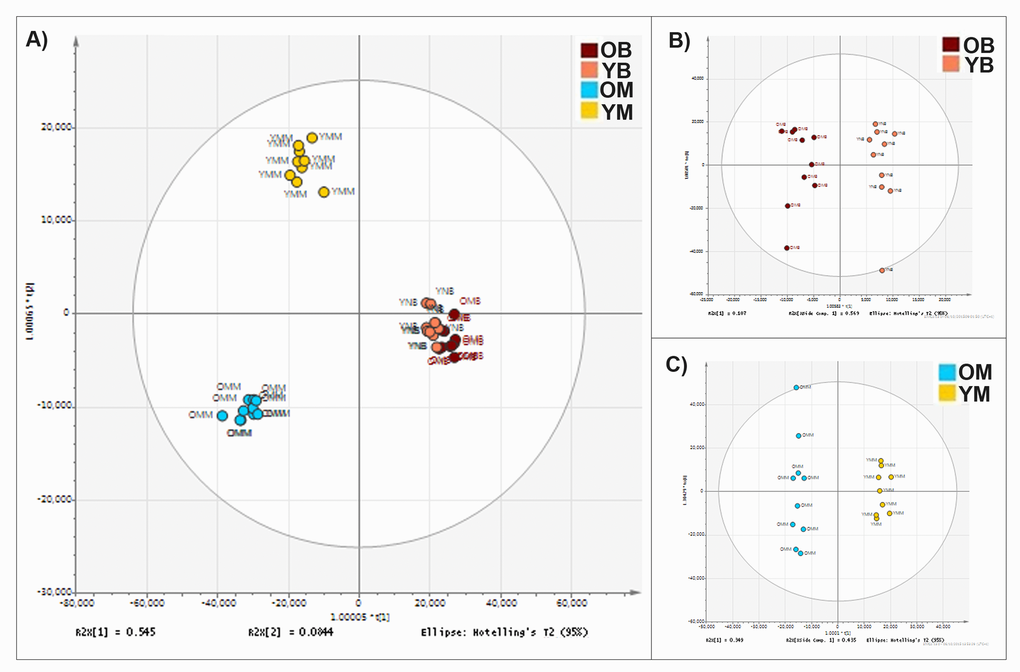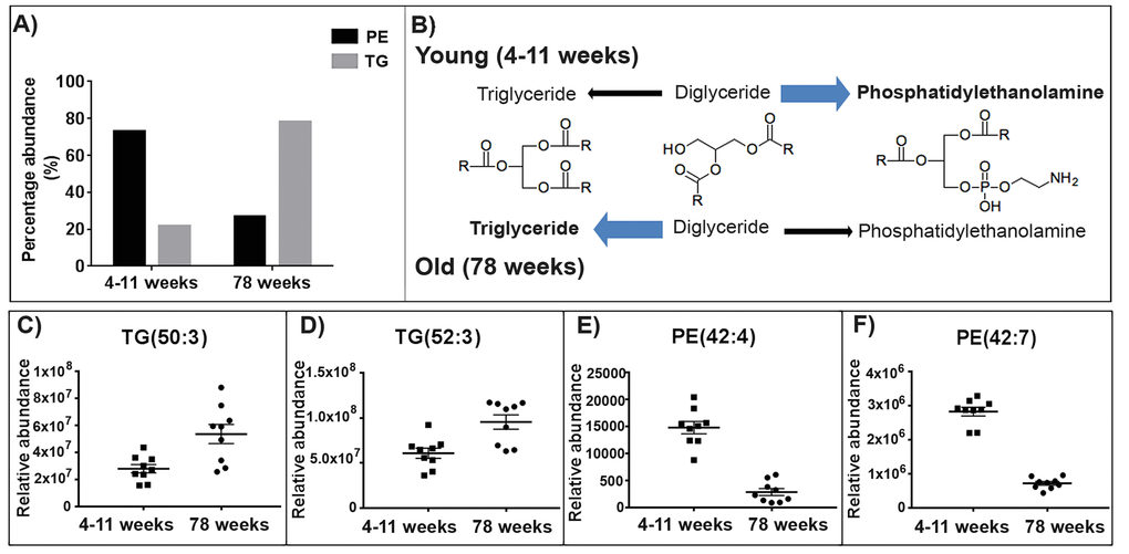 An increase in the abundance of triglycerides (TG) appears to be a characteristic feature of the aged skeletal muscle mitochondrial lipidome (Fig. 5A). Representative scatter plots are shown for two of the triglycerides identified with the greatest fold change (Fig. 5C and 5D). The lipid m/z 846.753, tentatively identified as TG (50:3) increases in abundance in the old skeletal muscle mitochondria by a fold change of 1.92. The lipid m/z 874.785, tentatively identified as TG (52:3) increases in abundance in the old skeletal muscle mitochondria by a fold change of 1.57 (Supplementary Table 4).