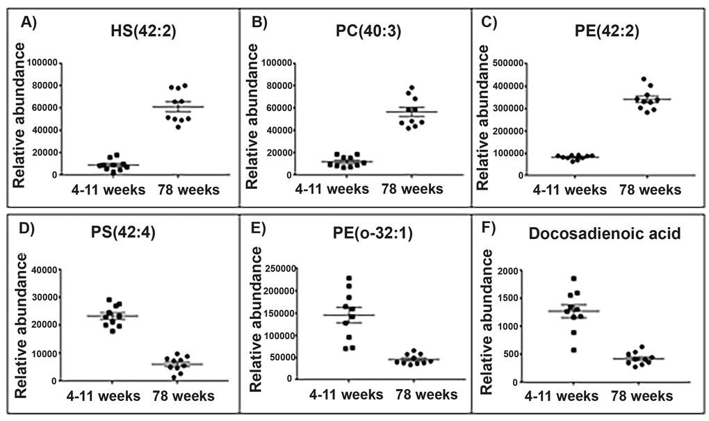 Three of the top five lipids to significantly increase in abundance in old brain mitochondria were identified as phosphatidylethanolamines and showed a fold change increase ranging from 3.22 to 4.17. Of the top five lipids to decrease with ageing brain, two lipids were identified as fatty acids. One of these two lipids, with a mass value (m/z 335.295), tentatively identified as docosadienoic acid C22:4, has a 3-fold significant decrease in abundance in aged brain mitochondria. The second lipid (m/z 307.264), tentatively identified as eicosadienoic acid C20:2, significantly decreases over two-fold in mitochondria of aged brain (Supplementary Table 1).
