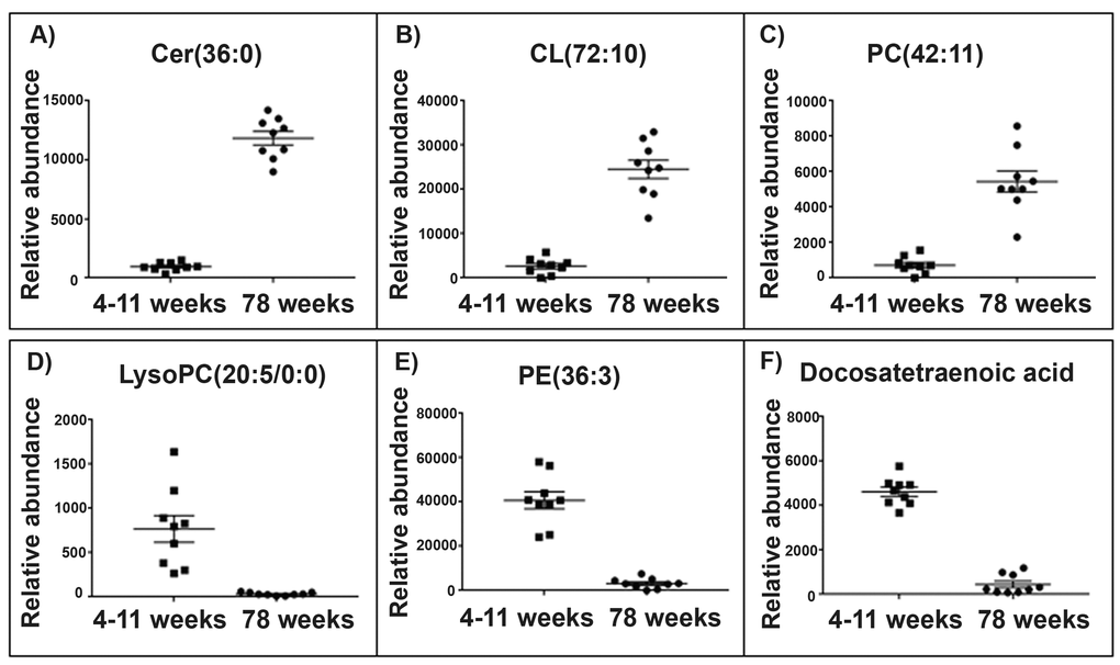 The top lipid changes to the brain and skeletal muscle mitochondria with ageing