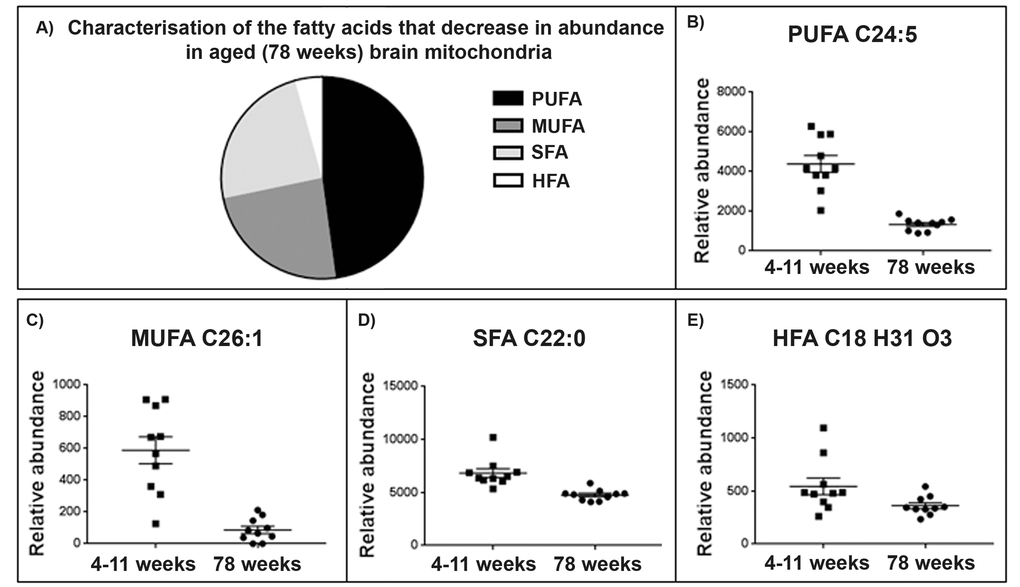 46 fatty acids are identified within our dataset using the Human Metabolome and Lipid Maps databases. This group can be further defined as consisting of polyunsaturated fatty acids (PUFAs), Monounsaturated fatty acids (MUFAs), saturated fatty acids (SFA) and hydroxyl fatty acids (HFA) (refer to Supplementary Table 3). We see a decrease in the abundance of most of these fatty acids with age in brain mitochondria (Fig. 3): 94% of them decrease in the old brain mitochondria with fold changes in the abundance of the lipids ranging from 0.80 to 27.62 (Fig. 4). Omega-3 PUFAs (ω3PUFAs) decrease and linolenic, docosapentaenoic acid, eicosatrienoic acid and docosahexaenoic acid specifically decrease in abundance in the 78 week old brain mitochondria. MUFAs, SFAs and HFAs also decrease in abundance in the aged brain mitochondria and make up the remaining 52% of the fatty acids identified (Fig 4B). Representative scatter plots for each fatty acid classes; PUFA, MUFA, SFA and HFA are shown (Fig. 4C-F).