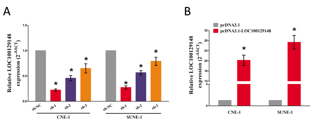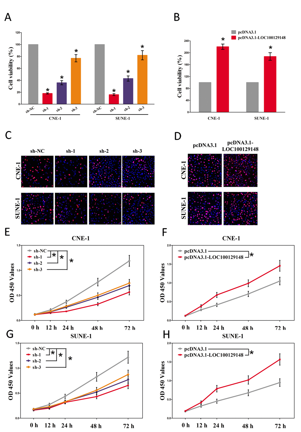 We also studied the impact of LOC100129148 on the proliferation of NPC cells. To this end, CNE-1 and SUNE-1 cells were transfected with control shRNA or shRNAs against LOC100129148, i.e., sh-LOC100129148#1 (sh-1), sh-LOC100129148#2 (sh-2), and sh-LOC100129148#3 (sh-3), pcDNA3.1 control and pcDNA3.1-LOC100129148. The qRT-PCR results indicated that sh-1, sh-2, and sh-3 effectively knocked down LOC100129148, and pcDNA3.1-LOC100129148 significantly increased LOC100129148 expression (Fig. 2A-B).