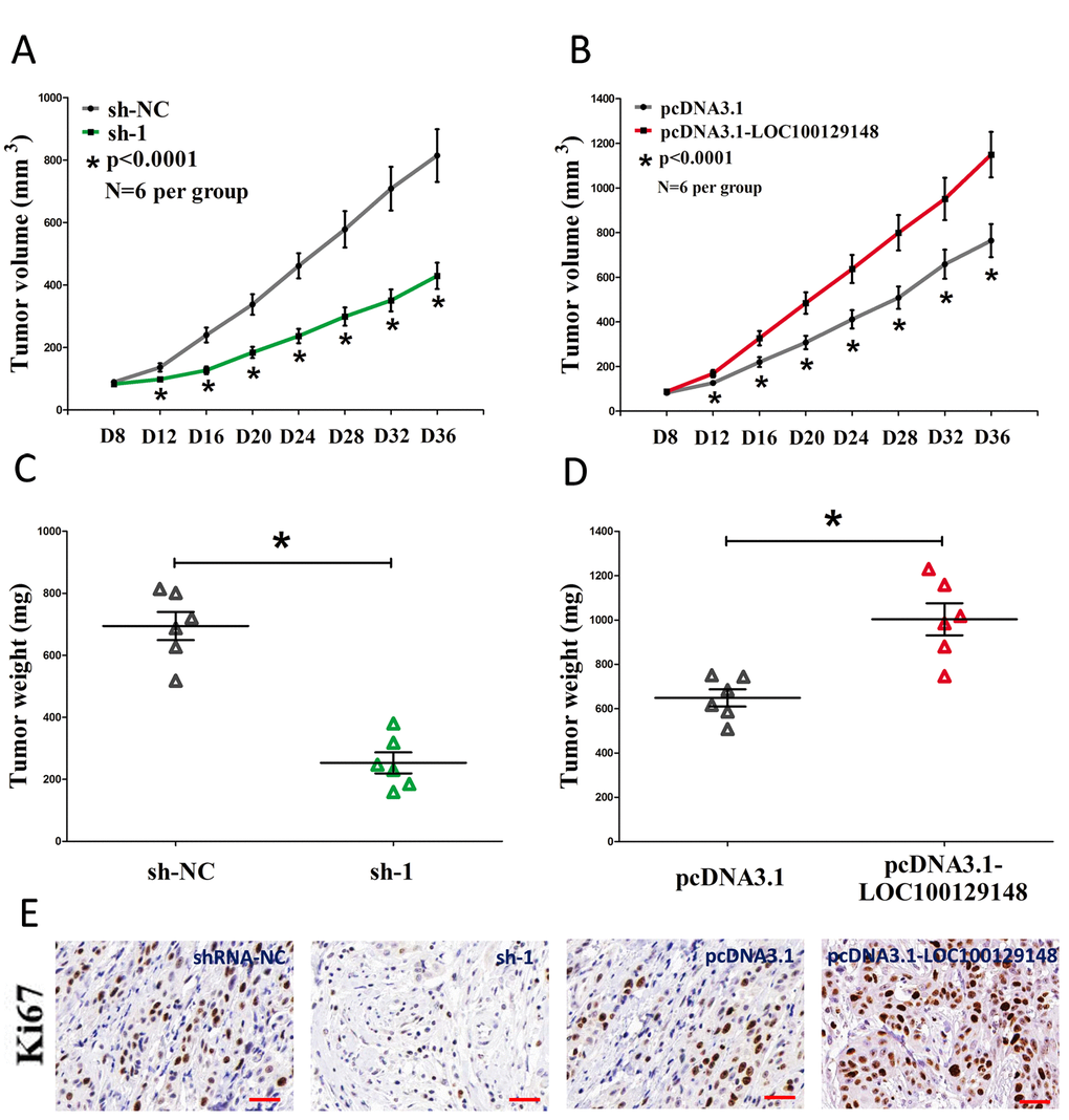 To further investigate whether knockdown of LOC100129148 expression could affect tumor growth in vivo, CNE-1 cells stably transfected with sh-1 or shRNA-NC, pcDNA3.1-LOC100129148 or pcDNA3.1-empty vectors were injected into male nude mice. Thirty-six days after inoculation, the tumor size and weight in the sh-1 group were markedly smaller/lighter in comparison to that of in their counterparts group, and the tumor size and weight in the pcDNA3.1-LOC100129148 group was markedly larger/heavier than that of in pcDNA3.1-empty vectors group (Fig. 4A-D). To further investigate the in vivo effects of LOC100129148, tumor cell proliferation was assessed using proliferation-related nuclear antigen Ki67 immunoreactivity assay. We found that up-regulation of LOC100129148 promoted tumor cell proliferation, and down-regulation of LOC100129148 inhibited tumor cell proliferation (Fig. 4E). Taken together, these results demonstrate that LOC100129148 plays a crucial role on NPC progression.
