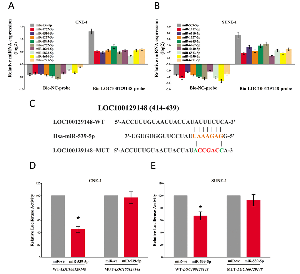 To identify which miRNA was the most one that enrichment in LOC100129148, we conducted a pull-down assay using a biotin-labeled specific LOC100129148 probe. And a biotin- labeled NC probe was used as a negative control. Then, qRT-PCR was conducted after precipitate. Results revealed that miR-539-5p was much richer in precipitate of LOC100129148 probe than that of in NC probe, and also much richer than that of in other predicted miRNAs (including miR-1252-3p, miR-6510-5p, miR-1227-5p, miR-6845-5p, miR-6762-5p, miR-4640-5p, miR-6823-5p, miR-4650-3p, and miR-6771-5p) (Fig. 5A-B). Moreover, we also conducted dual-luciferase reporter assay to further identify whether LOC100129148 was a functional target for miR-539-5p. Our data demonstrated miR-539-5p may suppress the luciferase activity of pmirGLO-LOC100129148-WT, but it has not affected the luciferase activity of pmirGLO-LOC100129148-MUT (Fig. 5C-E), which implied that miR-539-5p directly bound to LOC100129148 at the recognized sites.