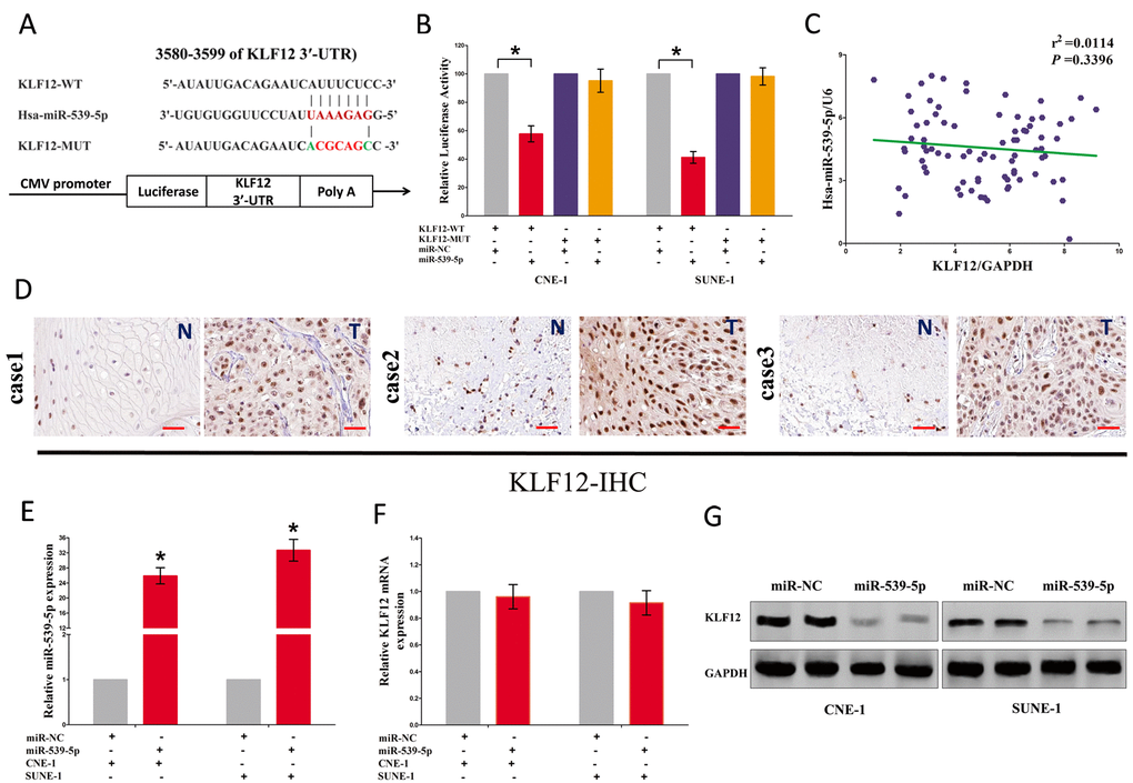 To explore the function of miR-539-5p on NPC, we screen Targetscan, miRanda, PicTar to select potential predicted targets of miR-539-5p. We identified the top 100 potential targets, and among these genes, we found a well-known oncogene, KLF12, which was up-regulated in a large number of malignancies. These revealed that KLF12 could be a direct target of miR-539-5p in NPC (Fig. 7A). Next, we used luciferase reporter assays to verify whether KLF12 expression are really regulated by miR-539-5p, and results demonstrate that miR-539-5p inhibits luciferase activity in CNE-1 cells and SUNE-1 cells at the reporter plasmid with a WT KLF12 3’-UTR, but no significant inhibition was observed at the reporter plasmid with a mutant KLF12 3’-UTR (Fig. 7B). However, our results also demonstrated the mRNA of KLF12 expression had no significant correction with the expression of miR-539-5p in NPC samples (r2 =0.0144, P =0.3396) (Fig. 7C). We also discovered that KLF12 was highly expressed in NPC tissues than that of in normal NP tissues, as demonstrated by IHC assay (Fig. 7D). We also found that transfection with miR-539-5p significantly up-regulated the miR-539-5p expression in CNE-1 and SUNE-1 cells (Fig. 7E). Moreover, miR-539-5p decreased the protein expression but had no influence on the mRNA expression for KLF12 in CNE-1 and SUNE-1 cells (Fig. 7F-G).
