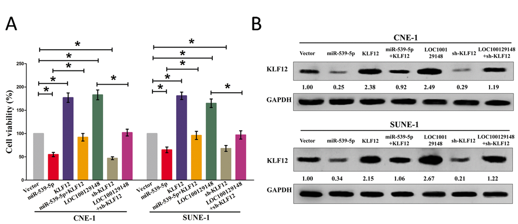 We then explored the role and mechanism of miR-539-5p on NPC cell growth. Results of Trypan blue staining revealed miR-5395p treatment suppressed cell growth, and pcDNA3.1-KLF12 treatment facilitated cell growth in CNE-1 and SUNE-1 cells (Fig. 8A). However, when treated CNE-1 and SUNE-1 cells with miR-539-5p plus pcDNA3.1-KLF12, the advantageous role of KLF12 on cell growth was reversed by miR-539-5p, and the growth-inhibitory effect of miR-539-5p was inversed by KLF12 over-expression (Fig. 8A). These data demonstrated that miR-539-5p suppressed cell growth by directly targeting 3’-UTR of KLF12 mRNA. Additionally, pcDNA3.1-LOC100129148 treatment reversed the growth inhibitory effect of sh-KLF12 in CNE-1 and SUNE-1 cells (Fig. 8A), which demonstrated that LOC100129148 facilitated cell growth partially through up regulation of KLF12. Furthermore, we next explored the role of LOC100129148 and miR-539-5p on the protein expression of KLF12. Results demonstrated that both miR-539-5p and sh-KLF12 treatment suppressed protein expression of KLF12, while both pcDNA3.1-LOC100129148 and pcDNA3.1-KLF12 treatment significantly enhanced protein expression of KLF12 in CNE-1 and SUNE-1 cells (Fig. 8B), respectively. However, when treated CNE-1 and SUNE-1 cells with pcDNA3.1-LOC100129148 plus sh-KLF12, the beneficial role of LOC100129148 on protein expression of KLF12 was suppressed by knockdown of KLF12, and the negative effect of sh-KLF12 was alleviated by over-expression of LOC100129148 (Fig. 8B). These findings suggest that the oncogenic role of LOC100129148 is mediated by miR-539-5p-KLF12 axis in NPC.