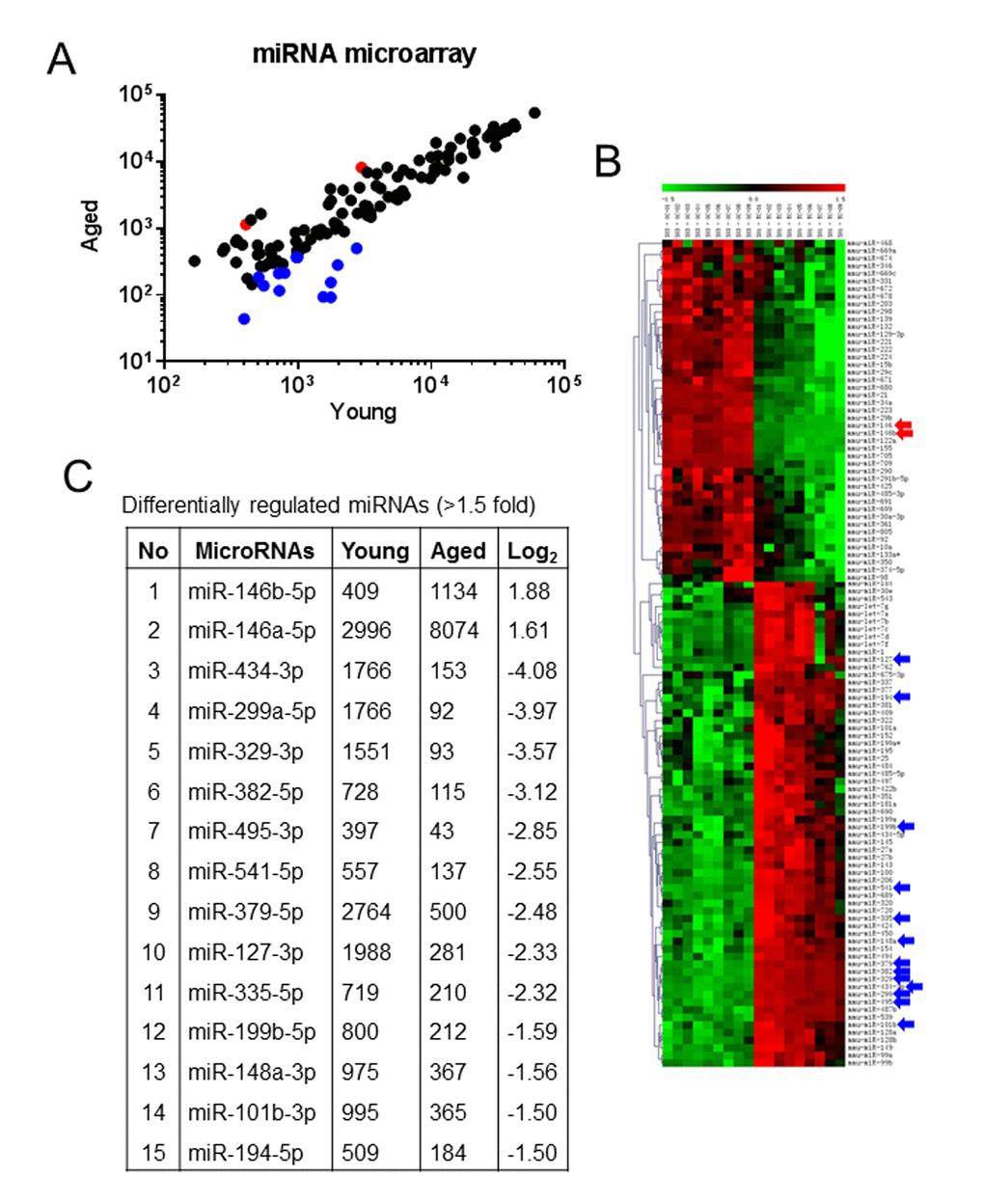 We isolated total RNA from the skeletal muscles of young and aged mice and used for microarray analysis as mentioned earlier [54,55]. The fold difference values of altered miRNAs were converted into log2 scale.