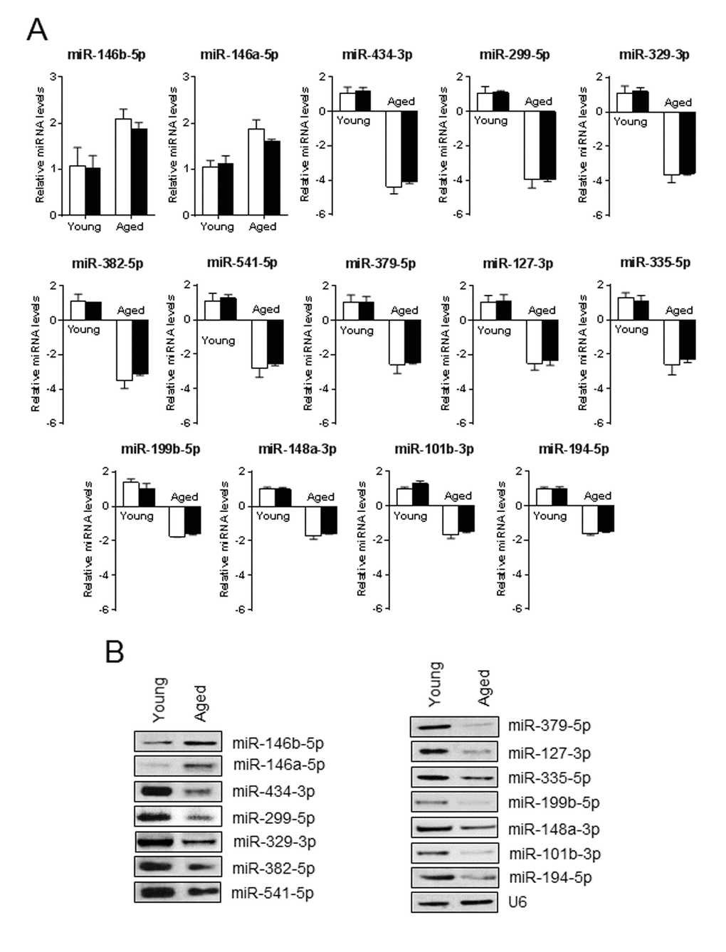 To explore the effect of aging in the regulation of miRNA expression profile in skeletal muscle, we performed a miRNA microarray screening using total RNA isolated from the gastrocnemius (GA) muscles of young and old mice. The array uncovered the induction of 117 miRNAs with the signal intensity ≥500 (the fluorescence amount of each miRNA probe is measured by a photo multiplier tube or charge-coupled device and signal scaled across the range of detection for the platform) in GA muscle (Table 1, Fig. 1A and 1B), including the highly downregulated miRNAs (≥1.5 fold) miR-194-5p, miR-101b-3p, miR-148a-3p, miR-199b-5p, miR-335-5p, miR-127-3p, miR-379-5p, miR-541-5p, miR-382-5p, miR-329-3p, miR-299-5p and miR-434-3p, and the highly up-regulated miRNAs (≥1.5-fold), miR-146b-5p and miR-146a-5p (Fig. 1C). Solution hybridization and real-time PCR assays confirmed the microarray findings (Fig. 2A and 2B). The small nuclear RNA U6, control, and a normalizer for miRNAs, was relatively unchanged and that excluded the possibility of artifactual changes in miRNA recovery.