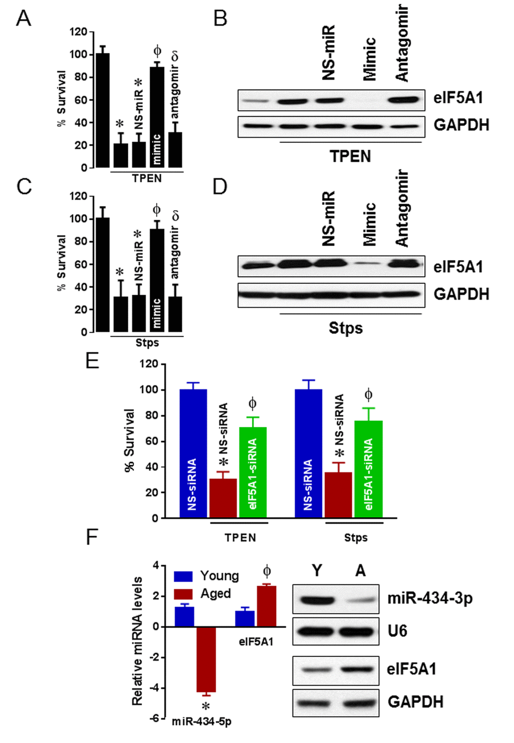 Previous studies have shown that eIF5A1 promotes apoptosis in a variety of cells [29–32]. Our prediction pathway analysis for miR-434-3p identified apoptosis as one of the skeletal muscle-specific pathways. Because eIF5A1 is a direct downstream target of miR-434-3p, we sought to determine if modulation of miR-434-3p would control apoptosis through eIF5A1 in myotubes. TPEN (a potent inducer of apoptosis) has been shown to induce apoptosis in myocytes [33]. Myotubes were transfected with miR-434-3p mimics or NS-miR for 36 h before treatment with TPEN for 24 h. Our data show that myotubes transfected with NS-miRNA before TPEN exposure had no protection against TPEN-induced apoptosis (Fig. 4A). In contrast, myotubes transfected with miR-434-3p mimics before TPEN treatment had an about 70% reduction in the percentage of apoptotic cells compared with myotubes transfected with NS-miRNA mimics. The transfection of miR-434-3p antagomir along with miR-434-3p mimics restored the TPEN-induced myotubes death (Fig. 4A). Western blot analysis indicated that TPEN-treated myotubes displayed an increased levels of eIF5A1 protein whereas myotubes transfected with NS-miR or myotubes that were not transfected had no effect on myotubes survival. On the other hand, transfection of myotubes with miR-434-3p mimics strongly reduced eIF5A1 protein levels and the cotransfection of myotubes with miR-434-3p antagomir reinstated eIF5A1 protein levels (Fig. 4B). To further confirm the role of miR-434-3p in apoptosis, we used staurosporine (Stsp), a well-known transcription inhibitors, has been shown to induce apoptosis in several cell types including myocytes [33,34]. While myotubes treated with Stsp had a higher percentage of death, transfection of those myotubes with miR-434-3p mimic increased the proportion of myotubes survival and co-transfection of myotubes with miR-434-3p antagomir reversed the effect of miR-434-mimic (Fig. 4C). Furthermore, loss of myotubes survival due to Stsp treatment correlated with a significant increase in the levels of eIF5A1 protein. Such altered expression of elF5A1 was reduced when those myotubes were transfected with miR-434-3p antagomir (Fig. 4D). In addition, knockdown of eIF5A1 by siRNA in myotubes significantly reduced the TPEN or Stsp -induced cell death (Fig. 4E), suggesting that eIF5A1 is directly responsible for the TPEN or Stsp -induced apoptotic effect. Furthermore, we found that GA muscle from aging mice displayed lower expression levels of miR-434-3p when compared to that in the GA muscle of young mice (Fig. 4F). In contrast, the levels of eIF5A1 mRNA and protein were higher in the GA muscle of aging mice when compared to that in the GA muscle of young mice (Fig. 4F). These data confirm that miR-434-3p protects myocyte from apoptosis induced by different apoptotic stimuli via eIF5A1 and a negative correlation between the expression of miR-434-3p and eIF5A1 in aging muscle.