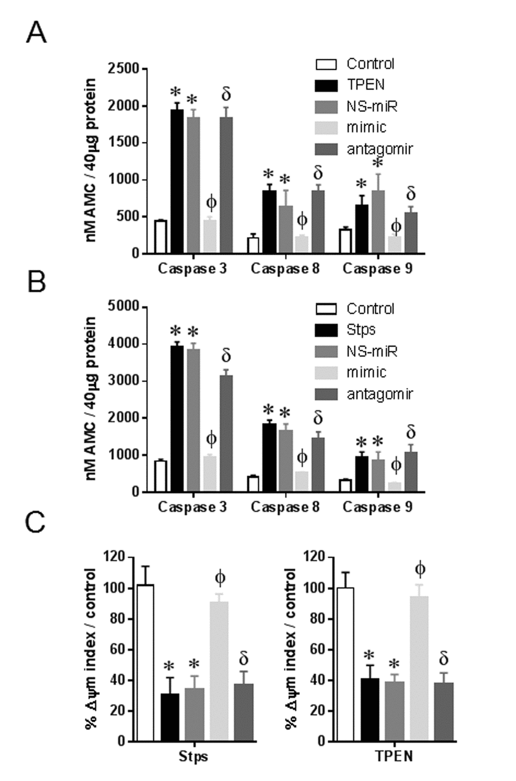 To determine whether miR-434-3p-regulated apoptosis involves inhibition of activation of caspases, the effects of their over-expression on the activation of executioner caspase-3 as well as initiator caspases -8 and -9 were examined in myotubes over a period of 24 h. All three caspases were activated in response to TPEN or Stps treatment; however, caspase 3 activity was dramatically higher when compared to caspases 8 and 9, especially in Stps treated myotubes (Fig. 5A and B). Myotubes transfected with miR-434-3p mimic significantly suppressed all three caspases activities, and the cotransfection of miR-434-antagomir restored the TPEN or Stps-induced caspases activities whereas myotubes transfected with NS-miR had no effect on all three caspases activities in response to TPEN or Stps treatment. One of the earliest events in the progression of apoptosis is the dissipation of the mitochondrial membrane potential (∆ψm). Our data in Fig 5C and D showed suppression of caspases 3, 8 and 9 activities by miR-434-3p, suggesting the possibility that miR-434-3p may maintain Δψm. JC-1 is a different cationic dye has been used to measure the collapse of the electrochemical gradient across the mitochondrial membrane [34,35]. In normal untreated myotubes, JC-1 is present as a red fluorescent aggregate in mitochondria, and in the green fluorescent monomeric form in the cytosol in myotubes. Upon the treatment with TPEN or Stsp, there is a dissipation of the ∆ψm indicated by the increase in staining in the green filter (530 nm) and a decrease in staining in the red filter (590 nm) in myotubes. Quantification of the fluorescent intensities indicated that myotubes treated with TPEN or Stsp significantly decreased the ∆ψm index while myotubes transfected with miR-434-3p mimic reversed the scenario; in contrast, the cotransfection of antagomir restored the effect of TPEN and Stsp in ∆ψm (Fig. 5C). These data suggest that the diminished depolarization of mitochondrial membrane potential of myotubes in response to TPEN and Stsp may be due to suppression of apoptosis by miR-434-3p through eIF5A1.