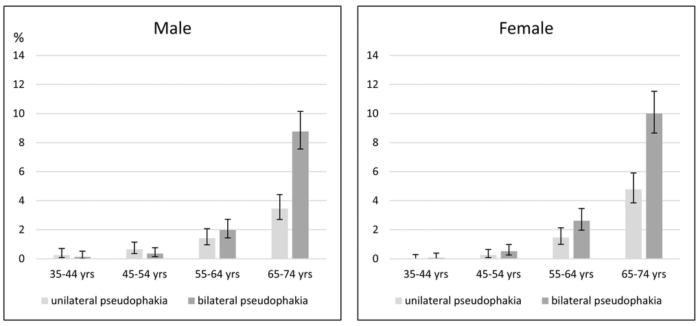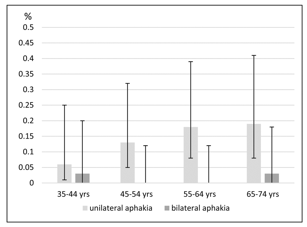 The weighted prevalence data for Germany for people aged 35 to 74 years are 1.36% [1.18% - 1.57%] for unilateral pseudophakia and 2.64% [2.39% - 2.91%] for bilateral pseudophakia. Unilateral aphakia was present in 0.14% [0.09% - 0.21%], and bilateral aphakia was present in 0.01% [0.00% - 0.05%]. The prevalence data are described separately for each decade of age and for each sex in Figure 2.