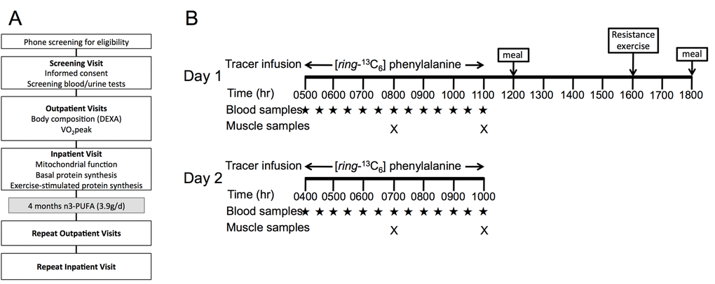 In the current study, we sought to translate early observations from mice to human aging by determining the influence of dietary n3-PUFA on muscle mitochondrial physiology, skeletal muscle protein synthesis, and anabolic response to acute exercise in healthy older adults. Twelve healthy young (18-35 years) and older (65-85 years) men and women were studied at baseline. Older adults were studied again following a 16-week open-label intervention of n3-PUFA supplementation at 3.9g/day. Skeletal muscle biopsies were acquired to evaluate the primary outcomes, which included mitochondrial respiration and ROS production, postabsorptive muscle protein synthesis rates, and the anabolic response to an acute bout of exercise (Figure 1).