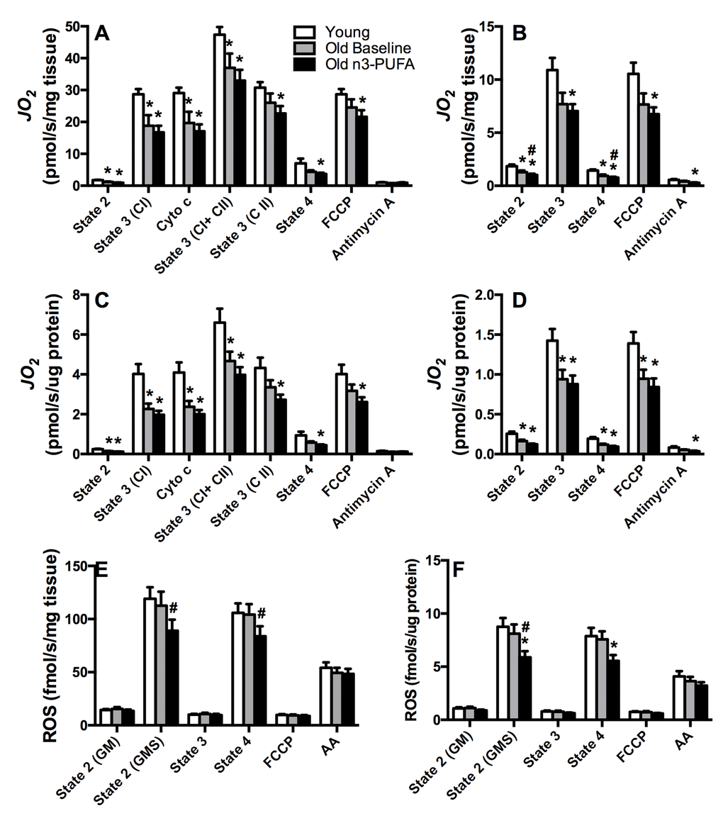 Mitochondrial oxidant emission is another parameter that helps define mitochondrial health. Although no age-related increase in mitochondrial ROS production was apparent in this study, we found that ROS emissions were significantly lower in older adults following n3-PUFA administration. Although polyunsaturated fatty acids have been proposed to have antioxidant properties [51], we are unaware of any precedent literature showing that these bioactive lipids have direct influence on oxidant emitting potential of mitochondria. We do not know the mechanism by which n3-PUFA reduce mitochondrial ROS production, but the finding that n3-PUFA reduce ROS production in older adults is important from the standpoint of muscle health with aging. Aging is often accompanied by increased oxidative stress and accumulation of damaged protein in skeletal muscle [52–54]. Discovering safe and effective ways to preserve the quality and function of the muscle proteome will help forestall many age-related derangements in skeletal muscle. In support of this, we previously found that n3-PUFA decreased post-translational modification of proteins in muscle of old mice [43]; a finding that is likely linked with the effects of n3-PUFA on ROS production and ROS scavenging by endogenous antioxidants.