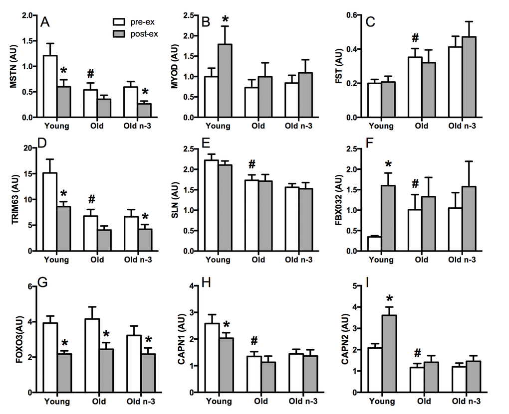 The Venn diagram in Figure 5F shows the genes that were significantly up or downregulated in response to exercise in young, old before n3-PUFA and old following n3-PUFA. The single bout of exercise altered 2,560 genes in young but only 483 genes in the older adults before the intervention. There were 439 genes in common between young and old. Following 16 weeks of n3-PUFA supplementation in older adults, there were 473 genes significantly altered in response to exercise. Of these genes, 326 were in common with pre-intervention gene responses, 398 were in common with young gene responses to exercise, and 50 were unique. We interrogated these 50 unique genes in an attempt to identify potential mechanisms that could explain the significant reduction of mitochondrial ROS production, increase in postabsorptive muscle protein synthesis, and potentiation of anabolic response to a single bout of exercise. Notably, there was downregulation of several genes known to be negative regulators of muscle growth and proliferation (dusp1, frzb, hbp1), downregulation of atrophy-related genes (bmp6), and upregulation of genes that promote protein synthesis (mrps12, spon2, prox1, nos1) and protein folding/assembly (fkbp2, sptbn4). Furthermore, there was downregulation of inflammation-related genes (mmd, cxcl9) and upregulation of the adiponectic paralig c1qtnf6, which modulates inflammation by countering the actions of TGF beta. Of the 9 candidate genes that were interrogated by RT-PCR, myostatin, a negative regulator of muscle anabolism, exhibited significant downregulation with exercise following n3-PUFA supplementation, which was not apparent before the intervention (Figure 3A). In sum, RNA sequencing revealed a transcriptional signature that is consistent with the observed mitochondrial phenotype in skeletal muscle from older adults. Furthermore, the transcriptional changes induced by a single bout of exercise were attenuated in older adults compared to young with subtle effects of n3-PUFA on baseline muscle gene expression or gene expression changes following a single bout of exercise. However, the expression of small number of genes that regulate muscle protein turnover and inflammation were uniquely altered by exercise in older adults only after 16 weeks of n3-PUFA supplementation.