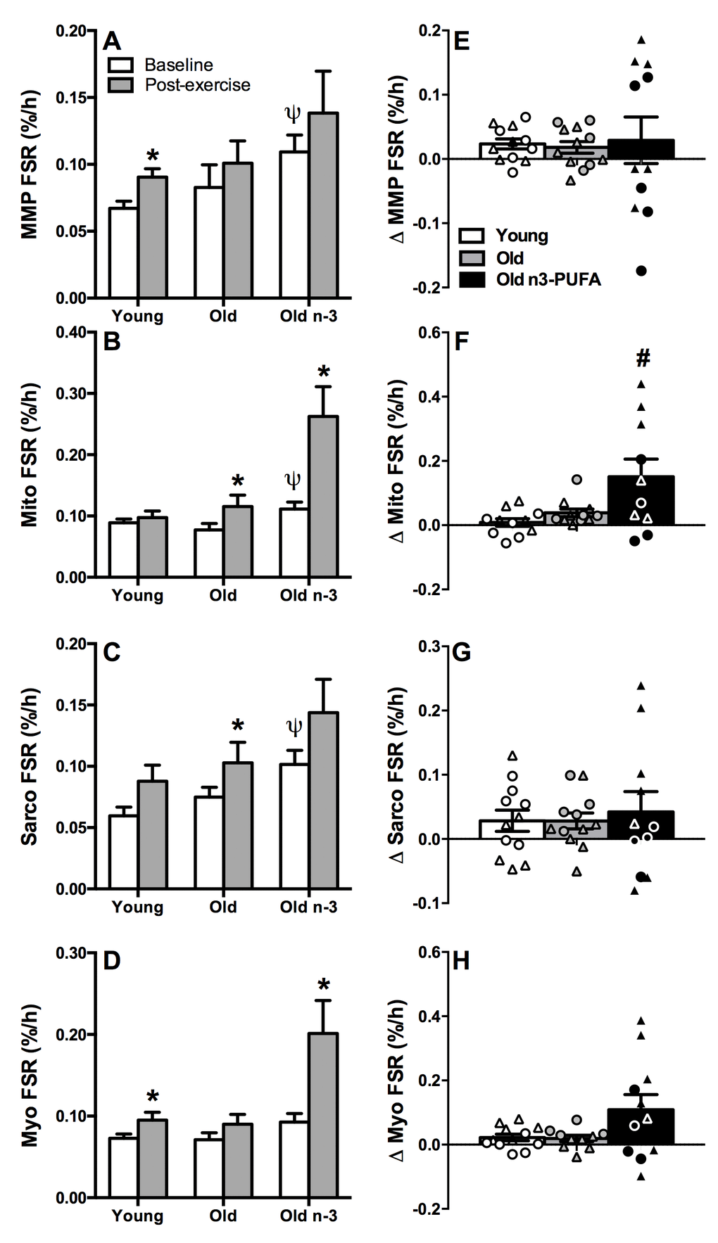 The measurements of postabsorptive and post-exercise muscle protein synthesis were repeated in older adults following 16 weeks of daily supplementation (3.9g/day) of n3-PUFA. There was a significant increase in postabsorptive mitochondrial (Figure 4B) and sarcoplasmic (Figure 4C) protein synthesis in older adults following n3-PUFA supplementation. Small but non-significant increases were also observed for mixed muscle (Figure 4A) and myofibrillar (Figure 4D) fractions in the basal condition. After exercise, FSR of mitochondrial and myofibrillar fractions were significantly higher than postabsorptive FSR (Figure 4B, D) with increases in MMP and sarcoplasmic fractions that did not reach statistical significance. The exercise-induced increment in FSR in each fraction was compared in a pairwise manner in older adults before and after the n3-PUFA intervention (Figure 4 E, F, G, H). There was notable heterogeneity in the response as indicated by the individual data points showing that some individuals exhibited robust increases in exercise-stimulated protein synthesis whereas others demonstrated little improvement. The exercise stimulated increase in mitochondrial FSR was significantly greater in older adults following n3-PUFA supplementation compared to young (Figure 4F). A similar trend (P=0.07) was observed for myofibrillar FSR (Figure 4H). In the mixed muscle and sarcoplasmic fractions, n3-PUFA enhanced exercise stimulated protein synthesis in only a fraction of the individuals, with others showing no change or even a decrease compared with pre-intervention values (Figure 4A, C).