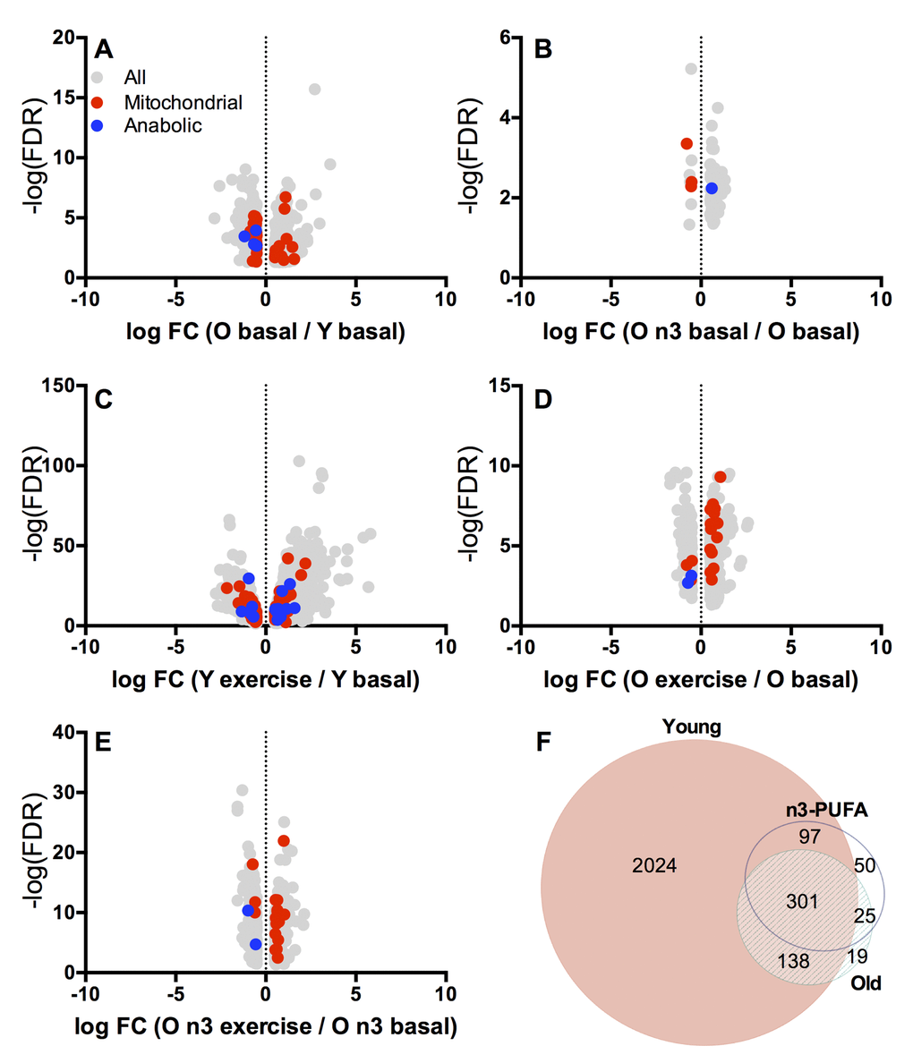 Unpaired ttests were used to compare mitochondrial parameters (respiration rates, ROS production) between young and old groups prior to the intervention. Paired ttests were used to examine the effects of n3-PUFA supplementation on these variables in older adults. For variables that were measured at multiple time points such as gene expression and FSR before and after exercise, we identified a priori comparisons that would be made using paired ttests (pre- vs. post-exercise in young, pre- vs. post-exercise in old, pre-exercise before vs. after intervention) as well as unpaired comparisons by ttests (baseline young vs. baseline old, post-exercise young vs. post-exercise old). When variables were not normally distributed, the Wilcoxon signed rank test was used for pre-post intervention for the older group, as well as for comparisons pre-post-exercise for both age groups. Continuous variables were summarized using mean ± SD or median (interquartile range, IQR) as appropriate. Statistical analysis was performed using JMP Software (SAS Institute, Cart, NC) and PRISM v6.0e (GraphPad Software Inc, La Jolla, CA). The Venn diagram in Figure 5 was generated using EulerAPE v3 (eulerdiagrams.org).