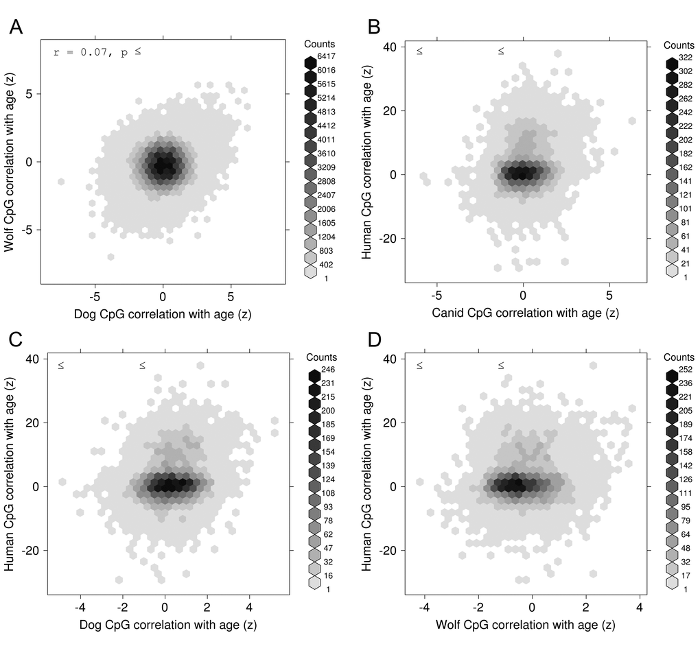 More broadly, our study demonstrates that DNA-methylation correlates with age in dogs and wolves as it does in human and related species. This age-dependence of DNA-methylation is conserved at syntenic sites in the respective genomes of these canid species as well for more distantly related mammalian genomes such as human. Strikingly, the age associations of syntenic CpGs is well conserved (r=0.20) even though the data were generated on different platforms (RRBS vs Illumina methylation array). Overall, our study demonstrates that dogs age in a similar fashion to humans when it comes to DNA methylation changes.