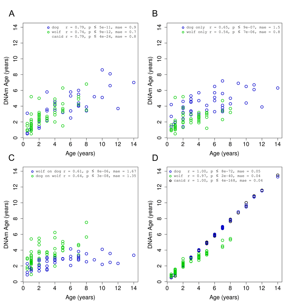 Race/ethnicity and sex have a significant effect on the epigenetic age of blood in humans [61]. Further, genetic loci have been found that affect epigenetic aging rates in humans [62]. It will be interesting to determine whether sex effects can also be observed in dogs and whether genetic background relates to the ticking rate of the canid clock. Based on our preliminary blood samples of 108 canid specimens, including both dogs and wolves, we accurately measured the methylation status of several hundred thousand CpGs. We demonstrate that these data can produce highly accurate age estimation methods (epigenetic clocks) for dogs and wolves separately. By first removing sites that were variable between dogs and wolves, we could also establish a highly accurate epigenetic clock for all canids (i.e. dogs and wolves combined). This clock allows us to estimate the age of half the canids to within a year.