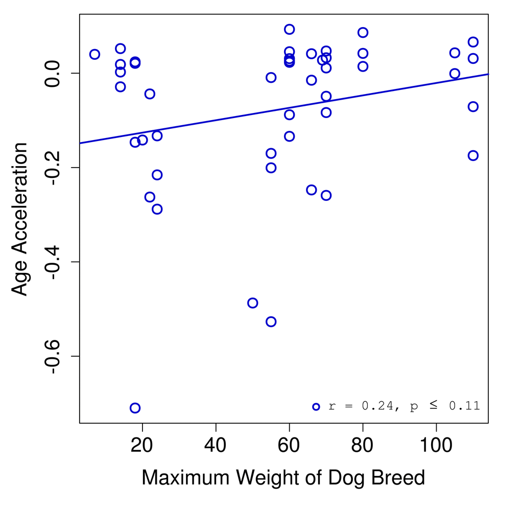 We found a correlation of 0.25 between age acceleration and breed weight (Fig. 3). Given the limited sample size for dogs (n = 46) we did not reach a significance below the standard threshold of 0.05. However, we expect that a study with a larger cohort might have sufficient power to show that these trends are in fact significant.