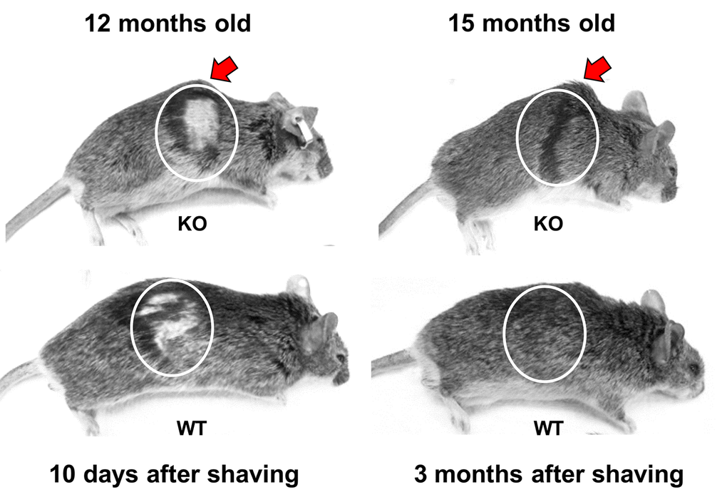 Hair re-growth declines linearly as a function of age [35,36]. Using a common hair-growth assay, we compared the ability of 12 m.o. WT and KO mice to re-grow hair. While all of the 12 m.o. WT mice (n = 5) partially re-grew their hair at 10 days post-shaving (Fig. 2) and had completely restored hair at 30 days post-shaving, none of the KO mice (n = 5) showed hair growth at 10 days and all of them failed to close the shaved area even at 3 months post-shaving (Fig. 2).