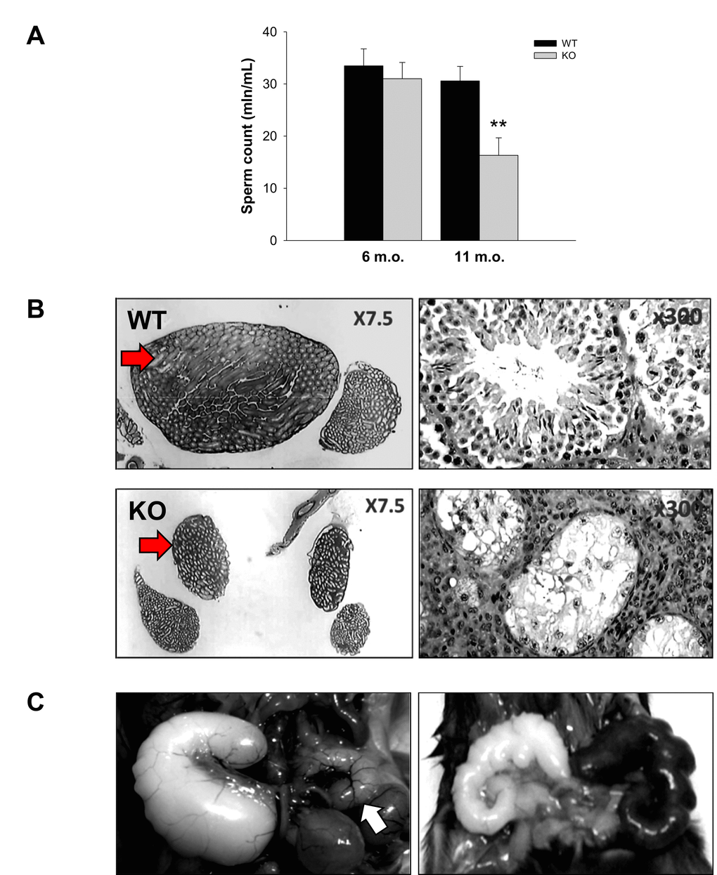 Enlargement of seminal vesicles in male mice infrequently occurs spontaneously in senescent mice at 24 months of age or later [[40]. We found that some KO males but not WT mice developed these aging lesions earlier in life (16-18 m.o.). We observed different types of lesions: asymmetrical vesicles enlargement (Fig 3C), symmetrical enlargement (data not shown), and enlargement with discoloration (Fig. 3C).