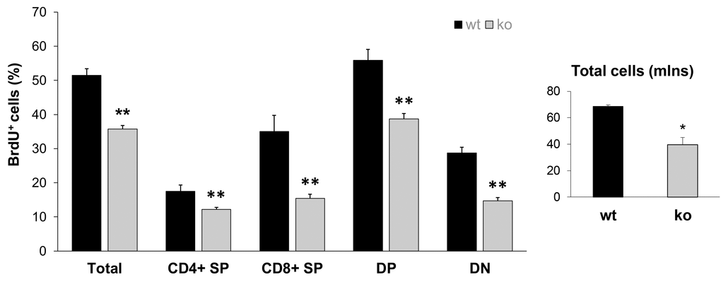 Mice were injected i.p. with 100 µg of 5-bromo-2-deoxyuridine once every day for 2 days. On the third day, mice received two injections 4 hours apart. 24 hours later, thymocytes were isolated, counted using trypan blue, and stained for CD4 and CD8 surface molecules using fluorochrome-coupled antibodies. Cells were then stained with anti-BrdU antibody following conventional methodology. Cells were analyzed in FACS Calibur instrument.