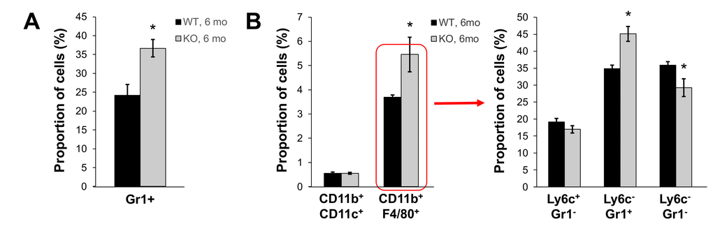 In our previous studies, we showed that young Fus1 KO mice have altered/exaggerated immune response to environmental and infectious stimuli [22,25]. Moreover, middle-aged Fus1 KO mice, but not WT mice, were prone to developing an autoimmune SLE-like syndrome [23,44]. We tested the hypothesis that Fus1 KO mice have low-grade chronic inflammation that helps them to clear non-lethal infections faster than WT mice at a young age [22], but plays a detrimental role and is involved in organismal aging when mice get older. We performed the analysis of peripheral and splenic myeloid and lymphocyte subsets in 6 m.o. WT and KO mice since this is the earliest age of the phenotypical manifestation of aging in Fus1 KO mice. In the lymphocyte compartments we did not find a prominent difference between WT and KO mice except for a significant decrease in CD3+ CD4+ T cells in Fus1 KO mice that we have already seen in young Fus1 KO mice, thus we did not consider it as an aging-associated change (data not shown). However, we found a significantly elevated number of Gr1+ myeloid cells in peripheral blood of Fus1 KO mice as compared to WT mice (37% vs 24% in KO vs WT, p ≤ 0.01, Fig. 5A). In the spleen, we detected a selective increase in the proportion of CD11b+F4/80+ macrophages (5.5% vs 3.7% in KO vs WT, p≤ 0.05 Fig. 5B) while a fraction of CD11b+CD11c+ dendritic cells was similar in both WT and Fus1 KO mice (Fig. 5). After co-staining of CD11b+F4/80+ macrophages with additional markers Ly6c and Gr1, we found an almost 30% elevation of CD11b+F4/80+Gr1+ cells (p≤0.05), which corresponds to inflammatory monocytes but may also include phenotypic MDSC (myeloid-derived suppressor cells) (Fig. 5B) often associated with chronic inflammation or cancer [45].