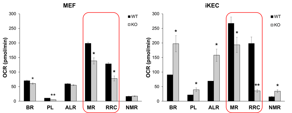 The two basic theories of aging, the Free Radical Theory of Aging (FRTA) [46] and its later modification, the Mitochondrial Free Radical Theory of Aging [47,48], agree that cumulative self-inflicted oxidative damage by ROS to mitochondrial DNA, proteins and lipids is one of the major causes of aging. Decline in mitochondrial activity, in turn, leads to enhanced ROS production that aggravates oxidative stress and mtDNA damage. We showed in several studies that Fus1 KO immune and epithelial cells produce higher levels of ROS at both basal and activated states [22,25,27]. Since unbalanced ROS production may be a result of defective mitochondrial respiration, we measured basal and stress-induced mitochondrial respiration in WT and Fus1 KO primary mouse embryonic fibroblasts (MEFs) and immortalized via serial passaging kidney epithelial cells (iKEC) using high resolution respirometry oxygraph-2k (Oroboros Instruments). We analyzed basal Oxygen Consumption rate (OCR) and stress-induced OCR after inhibition of different respiratory complexes. While primary WT and KO MEFs had similar rates of ATP turnover (ALR) and non-mitochondrial oxygen consumption (NMR), KO MEFs demonstrated significantly lower rates of basal respiration (BR) and proton leak (PL) (Fig. 6, left panel). Interestingly, iKEC had significantly higher rates of all these parameters (BR, PL, ALR and NMR) than the WT cells (Fig 6, right panel) indicating that immortalized Fus1 KO epithelial cells have higher rates of mitochondrial respiration at steady state conditions. This difference in the rate of respiration between primary MEFs and immortalized KEC cells may be explained either by cell specificity, or by immortalization state of iKEC, in which an increased respiration may be a pre-requisite for immortalization of Fus1 KO cells. However, both Fus1 KO cell models showed a common mitochondrial deficiency, namely, a significantly lower maximal respiration (MR) and reserve respiratory capacity (RRC) as compared to WT cells (Fig. 6, left and right panels, outlined bars). MR and RRC levels reflect the ability of cells to produce additional ATP in response to increased energy demands. The fact that MR and RRC deficiency of Fus1 KO cells were not dependent on a cell type or immortalization status suggests an intrinsic defect in the bioenergetic reserve capacity in all Fus1 KO cells, which may be a cause of premature aging in Fus1 KO mice.