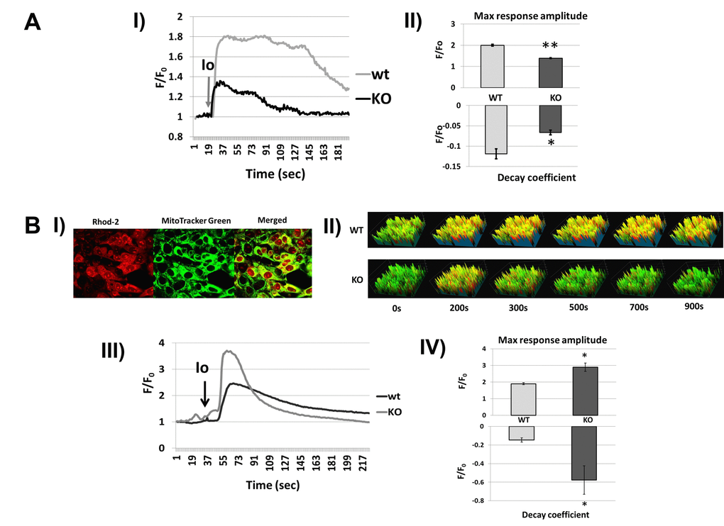 Fus1 KO iKEC treated with Ionomycin demonstrated a 45% lower amplitude of [Ca2+]c response and a 50% higher amplitude of initial [Ca2+]m elevation as compared to WT cells (Fig. 7A, Panel I). Another parameter, a coefficient of decay for [Ca2+]c response, which indicates a recovery of [Ca2+]c level after stimulus-induced rise, was also significantly different for both compartments, the cytosol and mitochondria (Fig. 7A, Panel II and 7B, Panel IV). The most pronounced difference was observed for [Ca2+]m decay: recovery to a steady-steady Ca2+ level after stimulation in Fus1 KO mitochondria occurred ~ 3 fold faster than in WT cells (Fig. 7B, panel IV). Thus, Fus1 loss in iKEC leads to impairment of Ca2+ dynamics in both cytosolic and mitochondrial compartments.