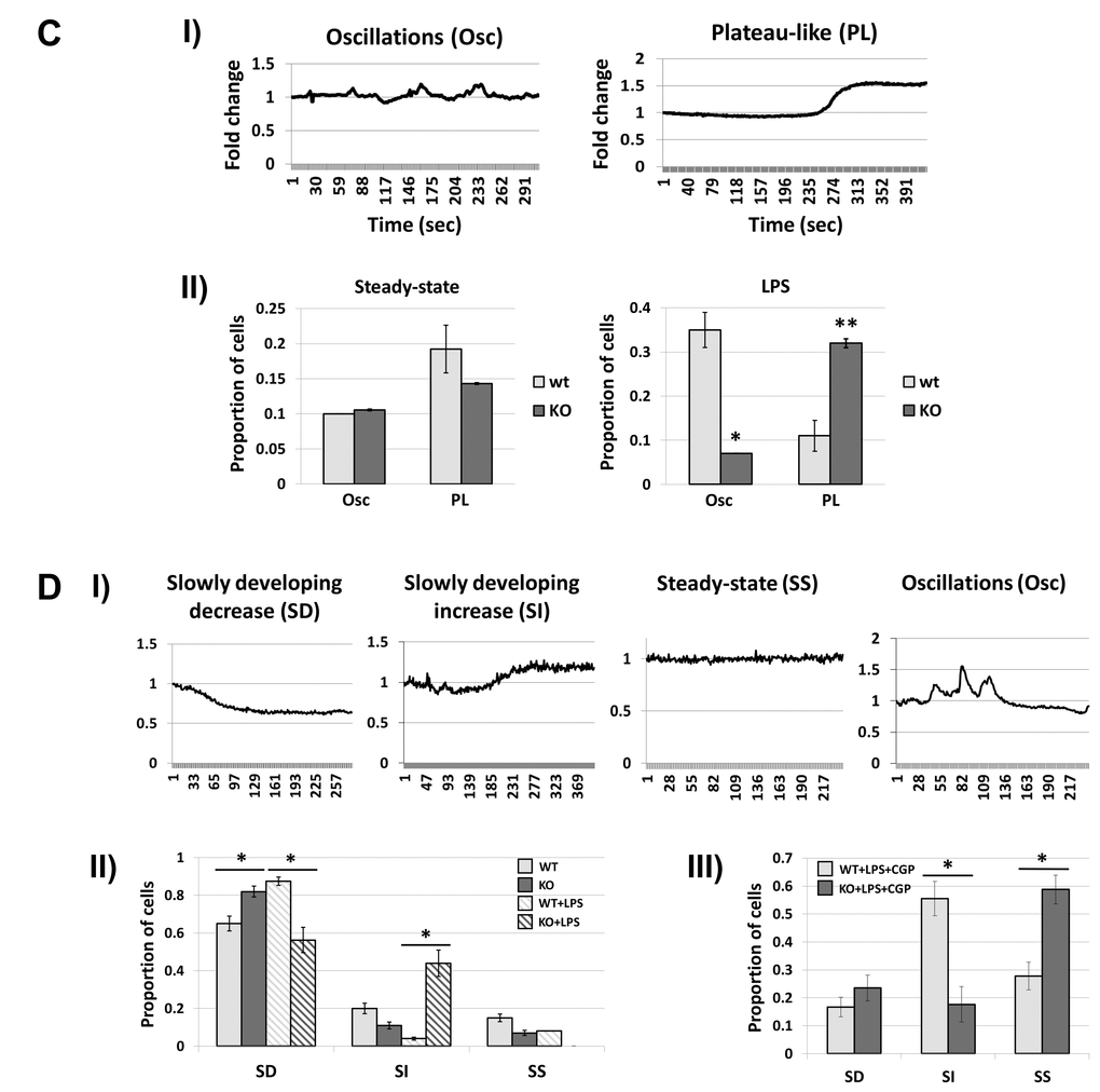 Next, we studied Ca2+ changes in MEFs during early inflammatory response, which normally precedes expression of pro-inflammatory cytokines. First, we established the baseline Ca2+ fluctuations. Two major patterns of [Ca2+]c changes, plateau-like (PL) elevations and low-amplitude oscillations (Osc), were observed (Fig. 7C, Panel I). We compared a proportion of cells with these Ca2+ patterns in WT and KO MEFs before and after LPS stimulation. Although steady-state WT and KO MEFs evoked similar basal fluctuations of [Ca2+]c, LPS treatment resulted in a significant increase in cells with Osc pattern in WT but not in KO MEFs, which had a higher proportion of cells with PL response (Fig. 7C, Panel II). Analysis of [Ca2+]m fluctuations showed the presence of four types of Ca2+ profiles in non-induced and LPS-induced MEFs: slowly developing decrease (SD) and increase (SI), steady-state (SS) level, and oscillations (Osc) (Fig. 7D, Panel I). Since the number of cells with Osc pattern were low (5-7%), we focused the analysis on three major types of Ca2+ response. Steady-state Fus1 KO cells demonstrated a slightly elevated SD-type of [Ca2+]m pattern (Fig. 7D, Panel II). However, in response to LPS stimulation, WT MEFs had significantly higher proportion of cells with a SD-type of response (Fig. 7D, Panel II) while Fus1 KO cells had significantly higher proportion of cells with SI-type of [Ca2+]m changes (Fig. 7D, Panel II).