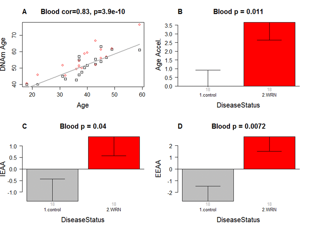 Here we show for the first time that measures of epigenetic age acceleration are indeed associated with WS status. Different from typical epigenome-wide association studies (EWAS) that interrogate individual CpGs, the current study posits a single hypothesis: WS is associated with epigenetic age acceleration in blood cells. In a secondary analysis, we also relate WS status to abundance measures of blood cell types that were estimated using DNA methylation data.