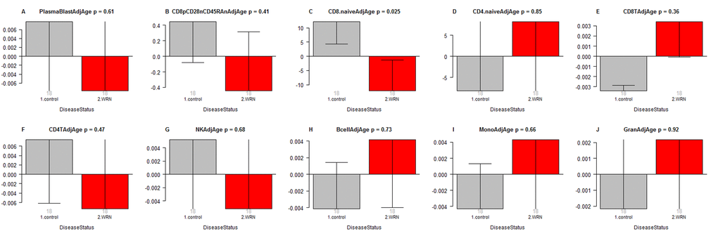 The theory is supported a) by our suggestive finding regarding the reduction of naïve CD8+ T cells in WS. However, the immunosenescence theory has several severe shortcomings including the following. First, the observed decrease in naïve CD8+ T cells only led to a p-value of 0.025 that is not significant after adjusting for multiple comparisons. This suggestive result requires replication in a larger study preferably involving flow cytometric measures. Second, the theory is inconsistent with our observed lack of an association between exhausted CD8+T cells and WS. Third, the observed epigenetic age acceleration effects are independent of changes in blood cell composition according to our multivariate model analysis.