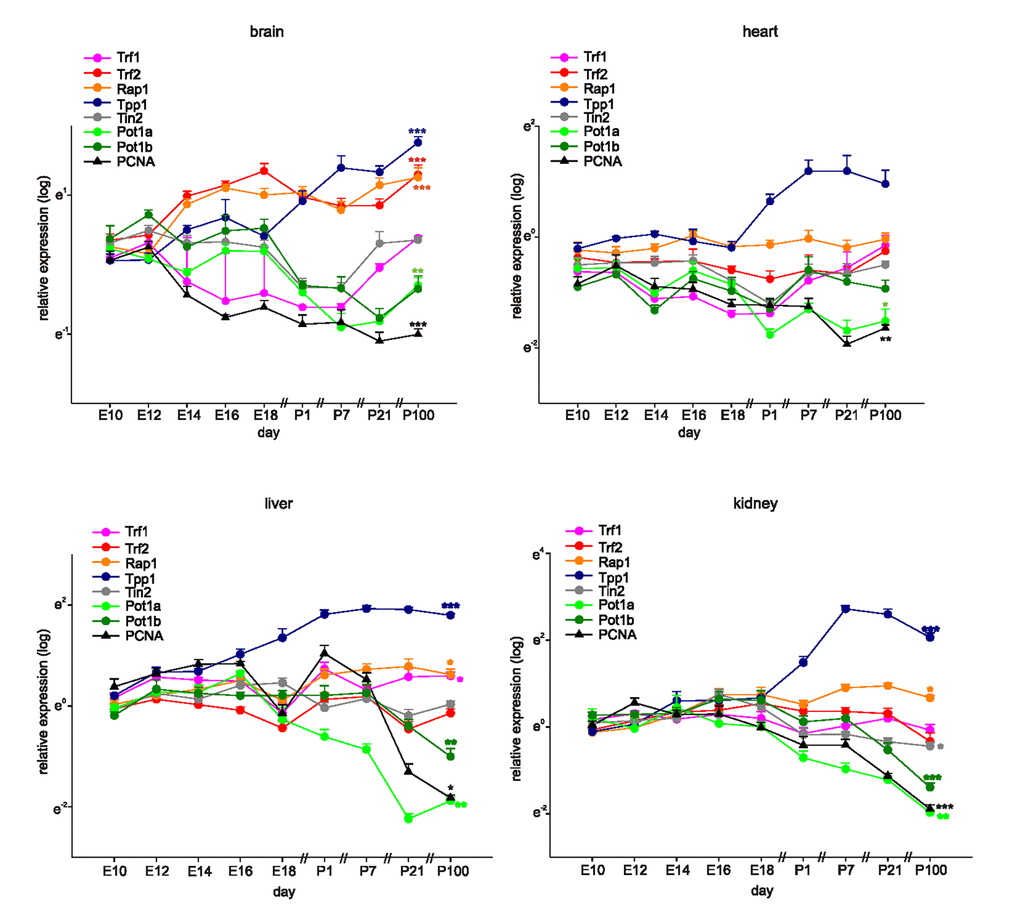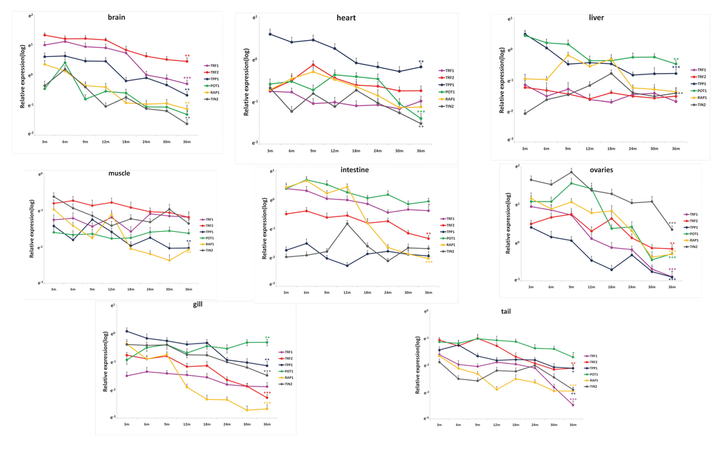 However, although many molecular and animal studies have manipulated the expression levels of shelterin subunits, only a few have examined the organ specificity of shelterin protein expression. We measured here shelterin gene expression levels in various tissues during development and early adulthood of mice and throughout the lifespan of zebrafish. This revealed distinct spatiotemporal regulation patterns of shelterin subunits during development and aging.