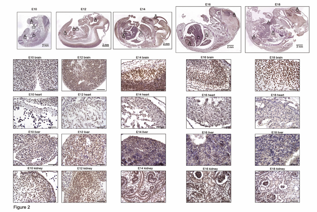 The persistent high level of TRF2 expression in the brain during both development and adulthood is in line with previous work showing that TRF2 expression specifically increases upon neural differentiation [12] [10,13]. Such expression was accompanied by production of a brain-specific cytoplasmic form of TRF2, termed TRF2-S, which lacks both the DNA-binding domain and the nuclear localization signal [14] [15]. However, we failed to detect marked cytoplasmic staining of TRF2 in neurons; the staining was predominantly nuclear (Figures 2-3). Overall, the results suggest that the nuclear form of TRF2 plays a key role in brain development and function.