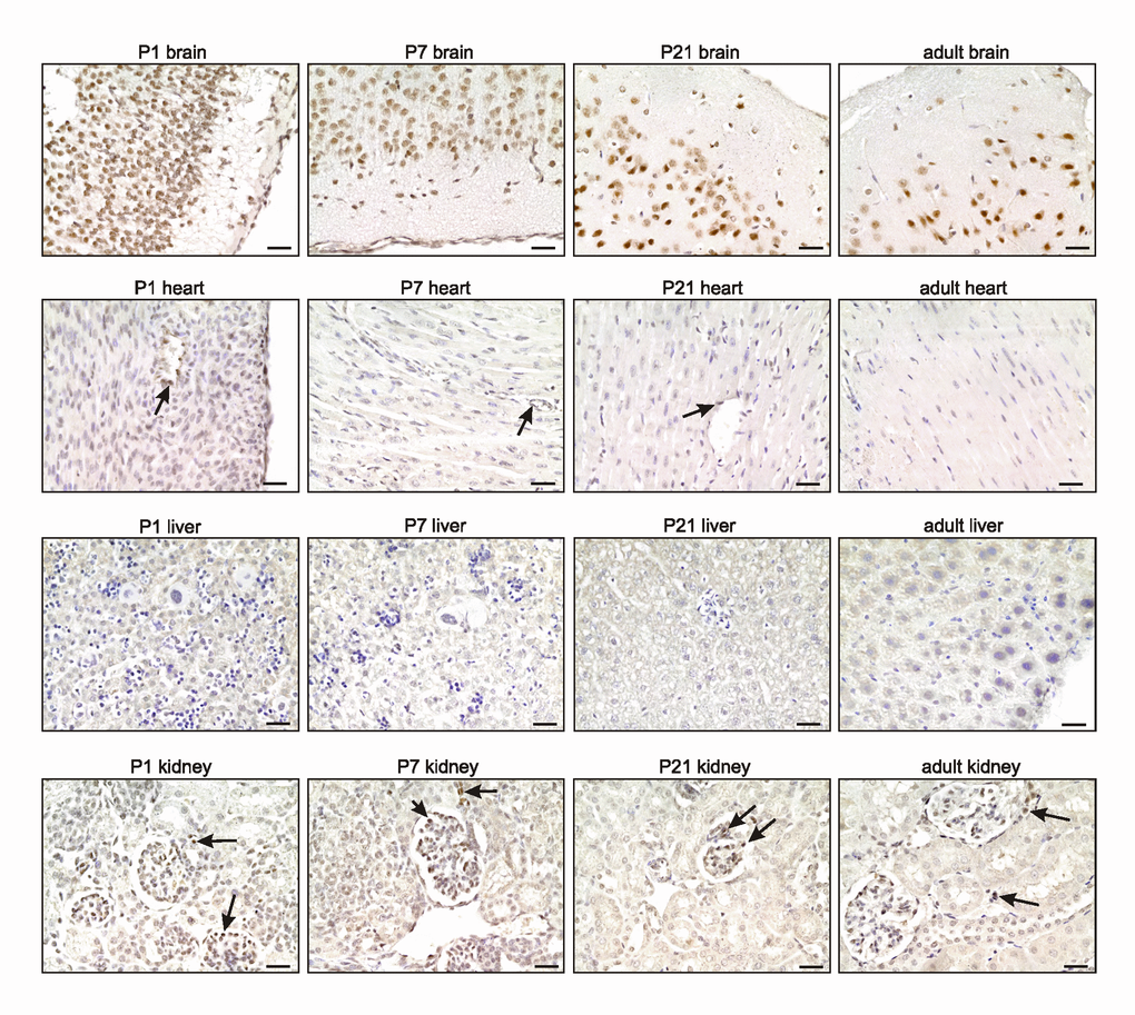 To evaluate in detail differential TRF2 protein expression during development, we stained mouse tissues for TRF2 during development until young adulthood (i.e., from E10 to P100). TRF2 was highly expressed in all tissues until E16, at which time expression began to decrease in the heart, liver, and kidney but remained high in the brain (Figure 2). This finding is in contrast to what was reported by Cheng et al. [10], who found that TRF2 was not detected in the brain to E18. This may be attributable to technical problems, as the authors used a mouse-derived antibody to examine mouse tissues. In the absence of extensive blocking procedures, this may create false-negative results caused by an enhanced background. During later development and young adulthood, we found that TRF2 expression decreased in the heart, liver, and kidney but remained stable in the brain; the protein was highly expressed in neurons (Figure 3, Supplementary Figure 1). In the heart, TRF2 continued to be expressed in some endothelial cells of the subepicardial vessels, but in the kidney, the expression thereof became restricted to glomerular podocytes and juxtaglomerular cells (Figure 3), in agreement with the recently described angiogenic properties of the protein and its expression regulation by the Wilms’ tumor suppressor WT1 [11].