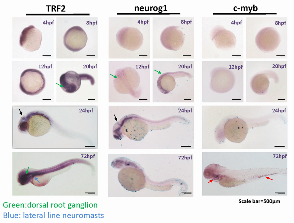 We performed whole-mount in situ hybridization of zebrafish embryos for TERFA mRNA using a cDNA probe (Figure 5). The signal corresponding to TERFA mRNA was present throughout the entire embryo from the blastula (4 hpf) to the gastrula (8 hpf) stage. In contrast, the neuronal marker, Neurog1 [16], was detected only in neuronal tissues and only from 12 hpf to hatching at 72 hpf, whereas the hematopoiesis factor c-MYB was detected only in hematopoietic tissue and then only during the late stages of development [17] (Figure 5). Interestingly, high expression of TERFA mRNA in the nervous system was maintained from the beginning of the somite stage to the time of hindbrain formation (20 hpf) and thereafter (Figure 5). This was also true for Neurog1, at 20 hpf, TERFA mRNA appeared to be expressed prominently in the dorsal root ganglion and midbrain boundary, in the regions of the neural tube that give rise to the neocortex, midbrain, and hindbrain, in the dorsal and ventral spinal cord, and in regions of the peripheral nervous system. These results are in agreement with the quantitative reverse-transcription PCR (qRT-PCR) data on zebrafish tissues (Figure 4) and the specific neuronal staining of TRF2 during mouse development (Figures 2–3 and Supplementary Figure S2). In summary, TRFA expression appears to be ubiquitous during early development but becomes progressively more restricted to neuronal tissues during later stages of development and into young adulthood.