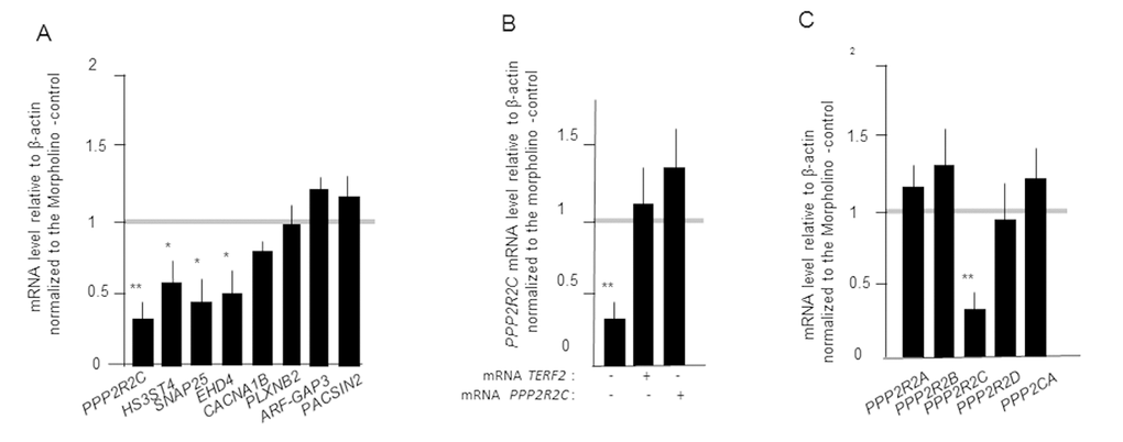 The above results suggest that TRFA has specific roles in zebrafish nervous system. Indeed, TRFA-compromised zebrafish show early-onset neurodegenerative phenotypes [18]. Moreover, TRF2 downregulation in mammalian neural progenitor and tumour cells alters neuronal differentiation by mechanisms that are distinct from those regulating telomere protection [13,19]. The ability of TRF2 to bind at or close to neuronal genes and to activate their transcription is an attractive mecahnism to explain the extratelomeric roles of TRF2 [9,20,21]. We tested this hypothesis by designing a morpholino antisense oligonucleotide (MO) targeting the TERFA gene and injected this MO into zebrafish embryos at the 1–2-cell stage. Then we tested in the MO-treated embryos the expression by RT-qPCR of eight neuronal genes that are bound by TRF2 in human cells [21]. The expression of four of them was decreased upon TRFA inhibition (Figure 6a). Among them, PPP2R2C encodes a neuronal isoform of the regulatory subunit of Protein Phosphastase 2A (PP2A). We ruled out an off target of the MO against TERFA by showing a rescue of PPP2R2C expression upon co-injection of TERFA mRNA (Figure 6b). Importantly, the expression of other, not neuronal specific, PP2A subunit genes is not TRFA dependent (Figure 6c), highlighting further the neuronal specificity of genes whose expression is regulated by TRFA in zebrafish. Interestingly, these results suggest that the network of neuronal genes regulated by TRF2 is conserved between human and fish.