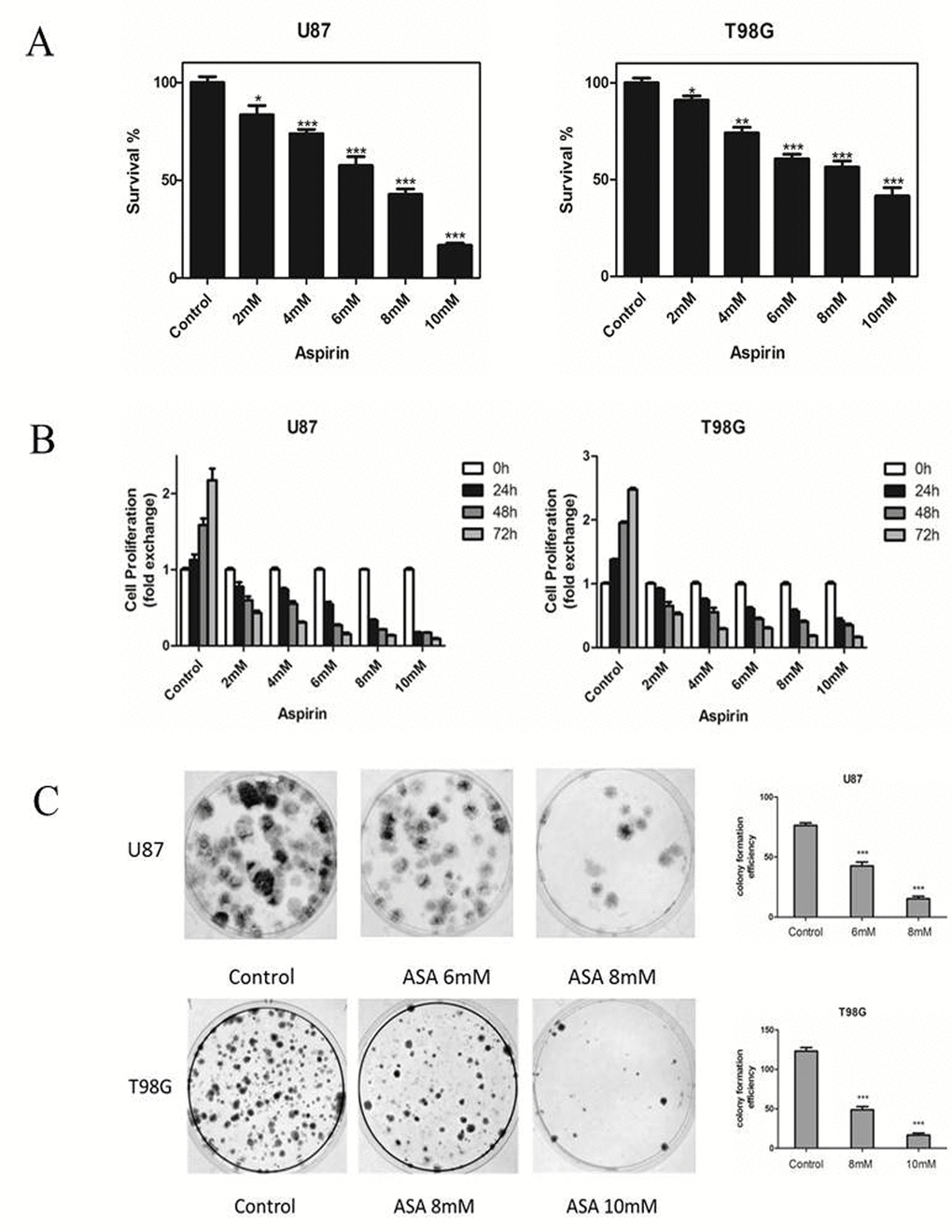 We first tested the effects of aspirin on the two glioma cells growth. The number of the cells decreased as measured by CCK-8 after 24 h treatment with aspirin compared with DMSO as control (Fig. 1A). The sensitivities to aspirin between the two glioma cell lines were different. The medial IC50 was 6.32 mM for U87 and 8.45 mM for T98G respectively. These results showed that aspirin was cytotoxic against glioma cells in a dose-dependent manner. Therefore, we separately chose 6 mM, 8 mM for U87 and 8 mM, 10 mM for T98G in the subsequent study. Next, we determined the cytostatic effect of aspirin on U87 and T98G cells. The two cell lines were exposed to graded doses of aspirin (2, 4, 6, 8, 10 mM) for different time intervals (0, 24, 48 and 72 h). Both cell lines showed a time-dependent manner with the aspirin treatment (Fig. 1B). Similarly, aspirin treatment also decreased the colony numbers in the two cell lines (Fig. 1C). These results indicated that the aspirin’s inhibition effect for glioma cells was dose-dependent and cumulative over time.