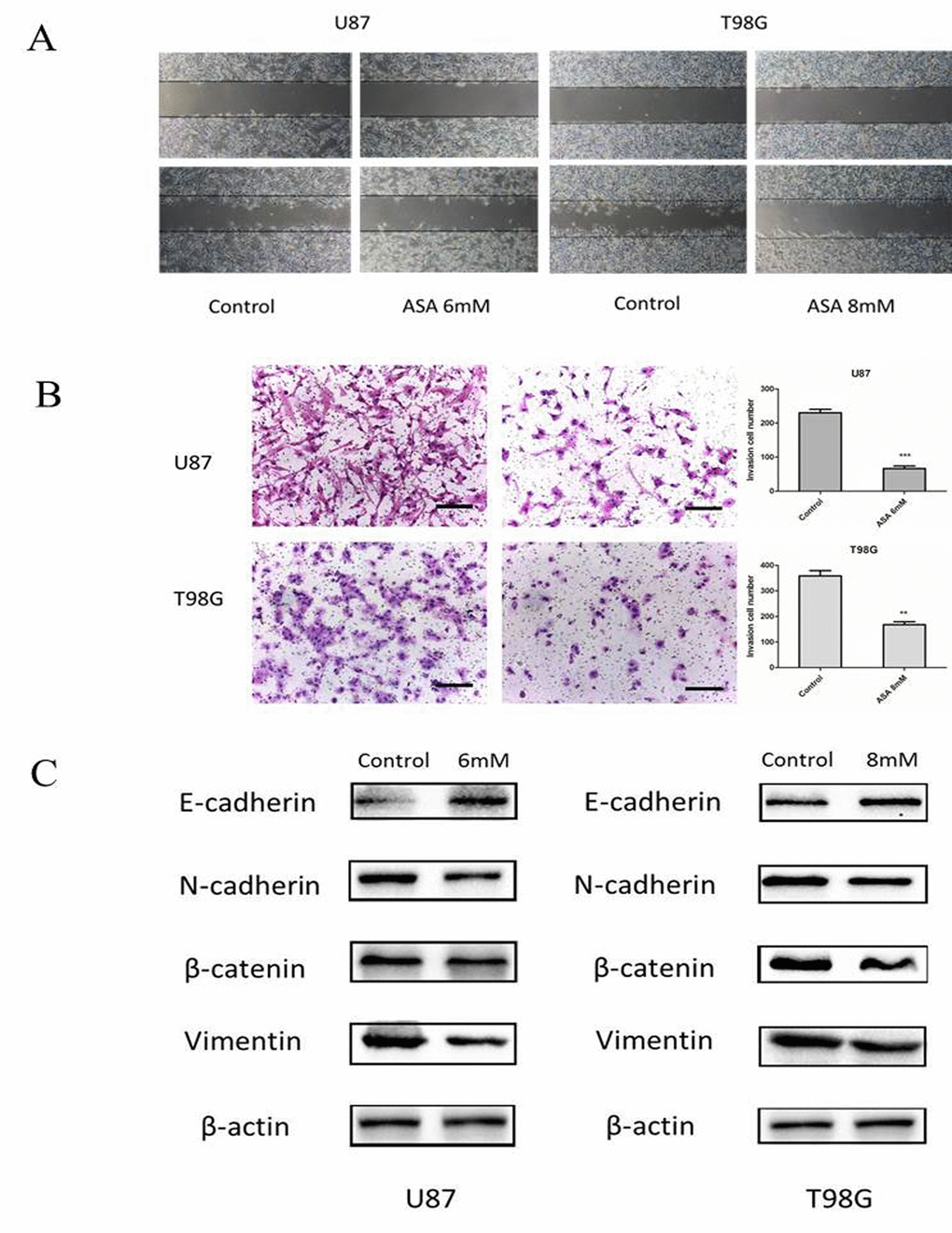 U87 and T98G cells were seeded into the 6-well plates until more than 70% of confluent growth. The cells were manually scratched with a sterile pipette tip, washed with PBS, and replaced with serum-free culture medium. Photographs of the scratch-wound gap were taken at 0 and 24 h by an Axiovert 200 microscope (Carl Zeiss). For each well, at least three different fields along the scratch were analyzed in triplicate. Invasion assays were done in a 24-well Transwell chamber (Corning). Briefly, aspirin treated cells were plated in the upper chamber of Matrigel-coated well, 1 × 105 cells seeding in 200 μL of serum-free medium. 500 μL medium containing 12% FBS was added to the lower part of the chamber. After incubation for 24 h, the cells on the upper surface of the membrane were removed and the filter on the lower surface of the chamber was fixed with methanol for 20 min and stained with hematoxylin-eosin for 5 and 1 min and quantified under a microscope.
