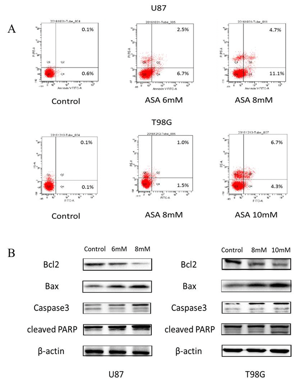 The FITC Annexin V Apoptosis Detection Kit I (BD Pharmingen, USA) was used to detect and quantify apoptosis by flow cytometry. In brief, U87 and T98G cells in the log phase of growth reached 70–80% confluence. Aspirin was added to the medium at indicated concentrations. After 24 h, the cells were harvested and collected by centrifugation. Cells were resuspended at 1x106 cells/ml with binding buffer, added 5 μL FITC Annexin V and 5μL PI and incubated for 15 min. Then the stained cells were immediately analyzed using by flow cytometry (FACSCanto II, BD Biosciences, USA).