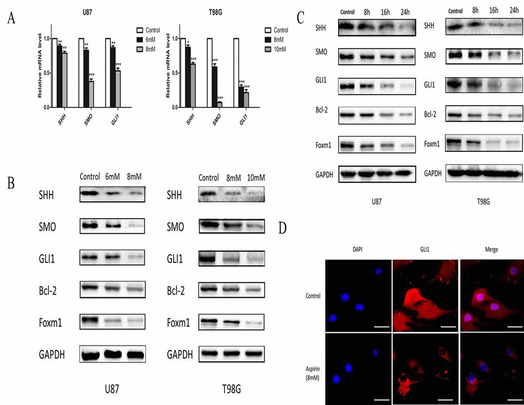 The Hedgehog signaling pathway is a key regulator of the central nervous system during embryogenesis, which is often up-regulated in many cancers like glioma and plays a role in both tumorigenesis and progression. SHH activates a signal transduction, leading to the activity of GLI1, which is the reliable marker of pathway activity. It regulates transcription of downstream oncogenes, such as Foxm1, Bcl-2 and N-myc, which played important roles on cell survival, invasion and cancer stem cell self-renewal [2]. In addition, it was indispensable for EMT and chemoresistance [3]. The SHH/GLI1 signaling had also been reported to be activated by different non-canonical pathways including the NF-κB pathway, which could be regulated by the nonsteroidal anti-inflammatory drug aspirin [4-6]. So, we assessed whether aspirin could be an effective agent in the treatment of malignant glioma via inhibiting the SHH/GLI1 signaling pathway pharmacologically.