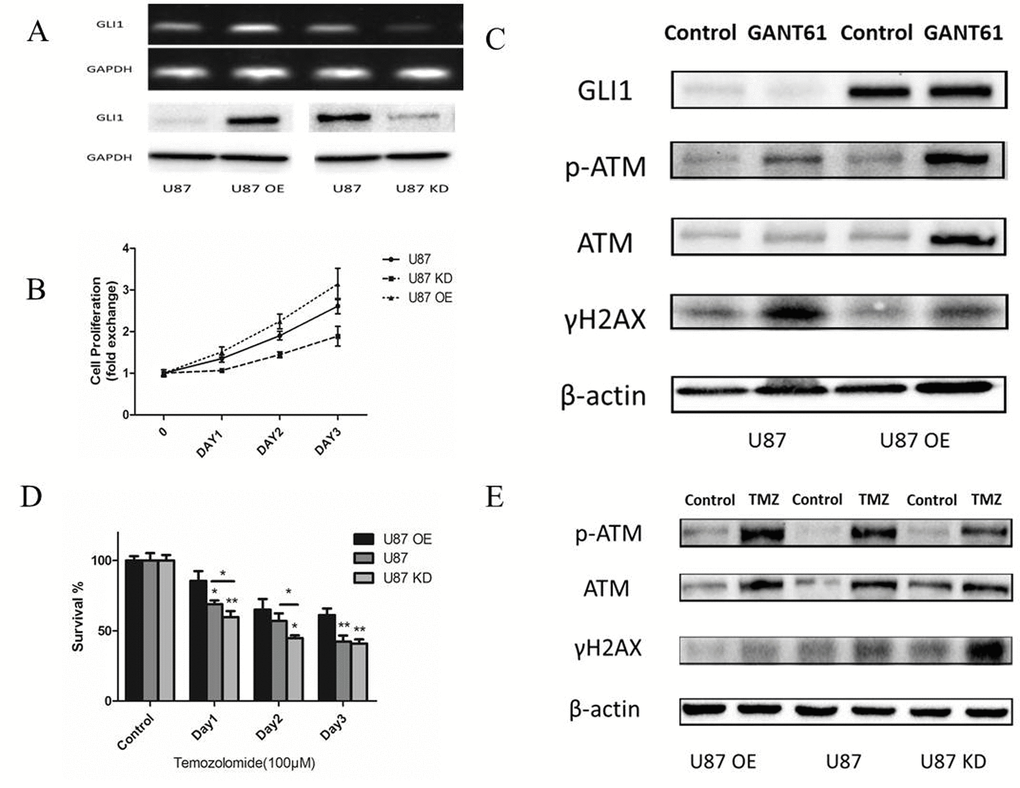 After we built the U87 stably overexpressing GLI1 (U87 OE) and U87 knowdown GLI1 (U87 KD) with the recombinant lentivirus construct, PCR and Western Blot were performed to verify the GLI1 expression (Fig. 5A). CCK-8 assay revealed that GLI1 overexpression could promote the growth of U87 cells and that the GLI1 knowdown could inhibit the growth of U87 cells (Fig. 5B). Then we used the GANT61 (5 μM), an inhibitor of the GLI1, to abrogate the GLI1 expression in the U87 OE and U87 and tested some DNA damage repair markers by the Western blot 48 h later. Our results showed that U87 OE had more p-ATM and less γH2AX compared with the U87, indicating that the overexpression GLI1 could strengthen DNA damage repair capacity and reduce the DSBs (Fig. 5C). Then, to determine the effect of GLI1 on cell sensitivity to TMZ, we treated U87, U87 OE and U87 KD cells with TMZ (100 μM) for 3 days. The overexpressed GLI1 increased the resistance against TMZ therapy as compared to control. On the other hand, the knockdown GLI1 enhanced the sensitivity to TMZ therapy as compared to control (Fig. 5D). Also, the Western blot analysis showed that the overexpressed GLI1 enhanced p-ATM and reduced γH2AX caused by TMZ therapy (Fig. 5E). The results displayed that GLI1 dependence manner for DNA damage repair activity could mediate non-canonical TMZ-resistance in glioma cells.