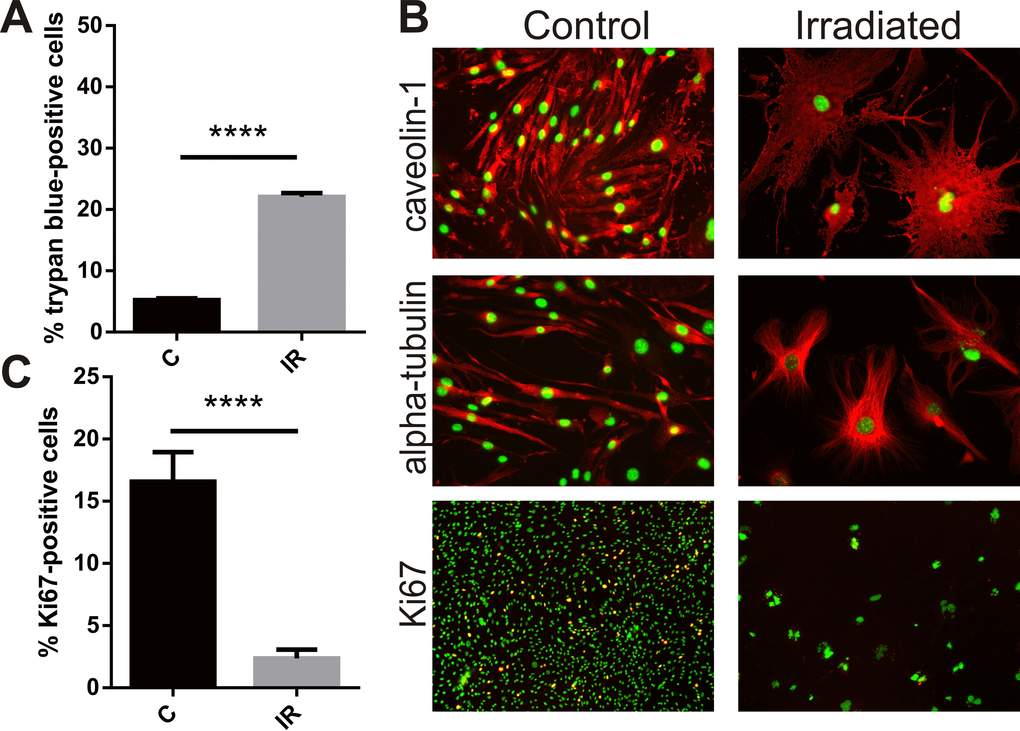Exposure of bEnd.3 cells to a single 20 Gy dose of radiation increased cell death as measured by the trypan blue viability assay. Six days after irradiation or sham treatment the proportion of dead cells in the irradiated group was 4-fold higher than in the non-irradiated cell population (P<0.0001) (Fig. 1A). For bEnd.3 cells that did not undergo apoptosis and die, adherent cells remaining after day 6 post-IR demonstrated a clear change in cellular morphology (Fig. 1B). Cells became flattened and hypertrophic with significant changes in cell shape and cytoskeletal structure (caveolin and alpha-tubulin staining, Fig. 1B). Cells positive for the proliferation marker Ki67 were significantly reduced in populations of radiation-stimulated cells (P< 0.0001) (Fig. 1B, C).