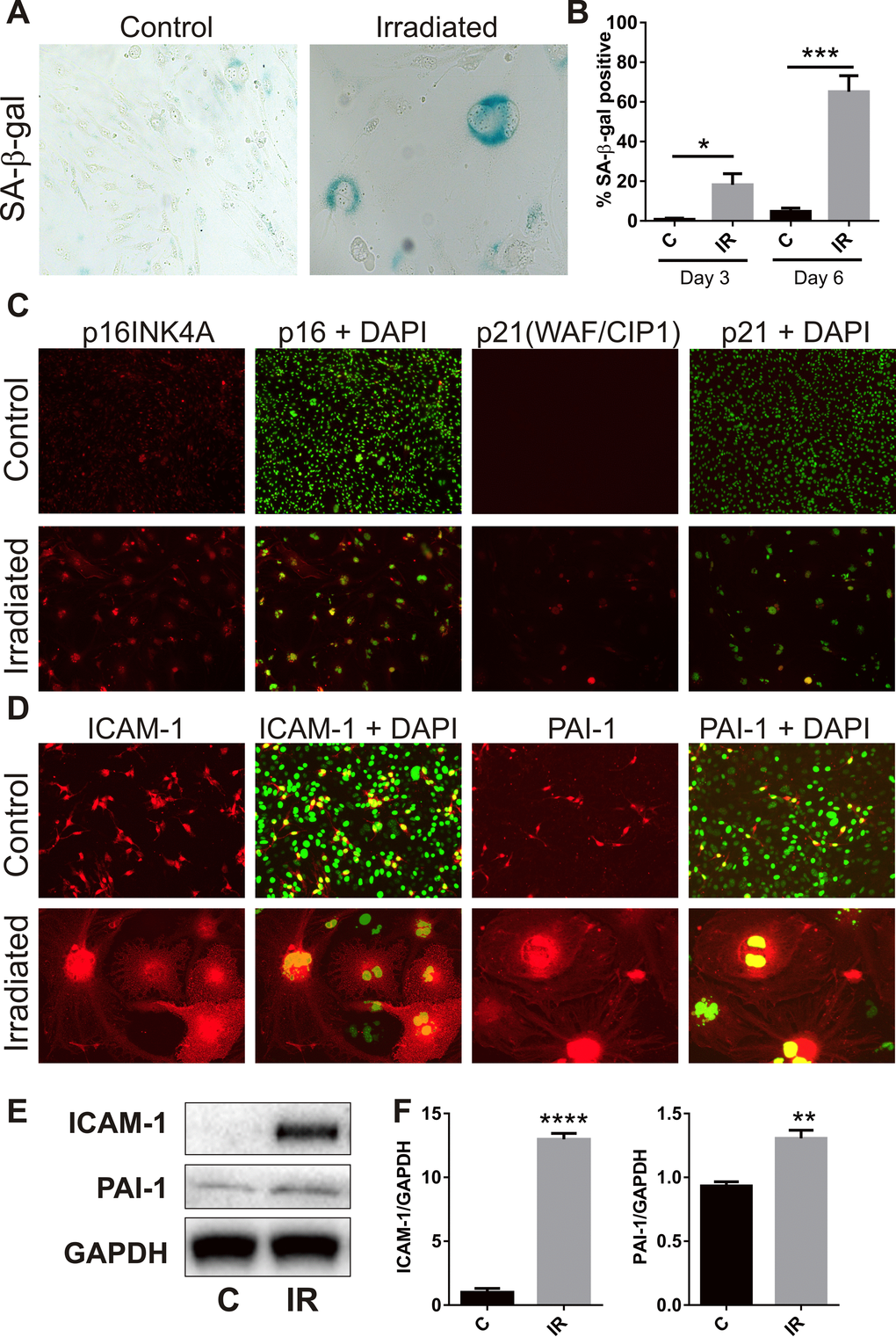 The majority of bEnd.3 cells remaining adherent 6 days post-irradiation demonstrated increased activity of the lysosomal enzyme, SA-β-Gal (Fig. 2A), a marker of cell senescence [28]. The proportion of SA-β-Gal positive cells reached 18 ± 6% at day 3 (P<0.05) and 65 ± 8% by day 6 (P<0.001) (Fig. 2B). Immunocytochemistry showed increased polyploidy, the presence of lobed nuclei and nuclear expression of the senescence-associated cyclin-dependent kinase (CDK) inhibitors, p21 (WIF/CAP) and p16 (INK4A) (Fig. 2C), as well as increased expression of the senescence markers intercellular adhesion molecule 1 (ICAM-1) and plasminogen activator inhibitor 1(PAI-1) (Fig. 2D) [29-31]. Western analysis of whole cell lysates confirmed up-regulation of ICAM-1 (P<0.0001) and PAI-1 (P<0.01) at the protein level (Fig. 2E, F).