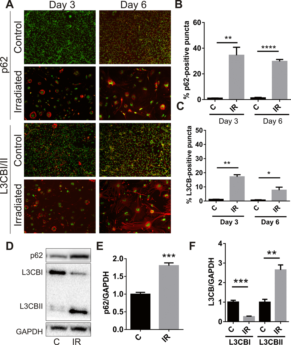 A recent study associated senescence with simultaneous or prior alterations in autophagy or autophagic flux [32], therefore accumulation of the autophagosomal proteins, p62 and microtubule-associated protein L3CBI/II, was examined. Immunocytochemistry demonstrated peri-nuclear accumulation of p62 in adherent cells at day 3 (34 ± 6%, P<0.01) and day 6 (29 ± 2%, P<0.0001) (Fig. 3A, B). Perinuclear accumulation of L3CB was also observed (17 ± 2% at day 3, P<0.01; 8 ± 2% at day 6, P<0.05) (Fig. 3A, C). In opposition to that observed for SA-β-Gal, the number of cells positive for perinuclear L3CB and p62 puncta appeared to decrease over time. Western analysis demonstrated increased total protein levels of p62 (Fig 3. D, E) and almost total conversion of L3CBI to the lipidated L3CBII form in irradiated cells by day 6 (Fig. 3D, F), changes consistent with a radiation–induced blockade of autophagic flux [33].