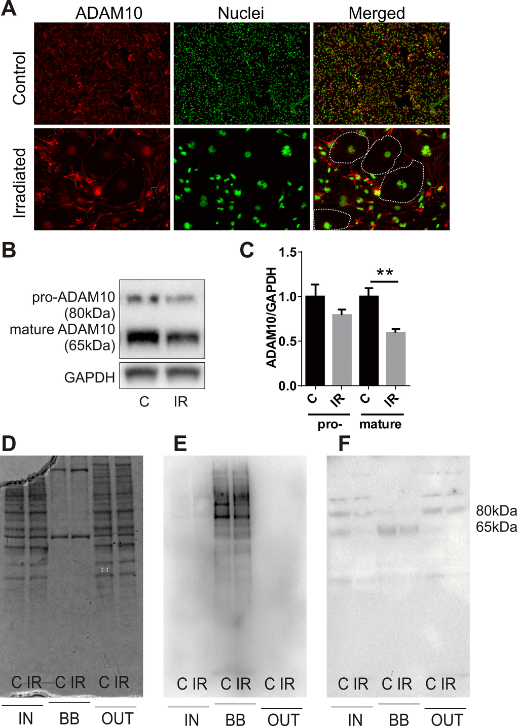 Examination of the proteomic data revealed the novel radiation-stimulated down-regulation of ADAM10 (a disintegrin and metalloprotease 10) (2.5-fold, P=0.05; Supplementary Table S3). ADAM10 is an alpha-secretase and ectodomain sheddase that plays an important role in the post-translational cleavage of multiple proteins both intracellularly and at the cell surface [36]. ADAM10 is the protease responsible for cleavage of the amyloid precursor protein (APP) in the brain to a soluble neuroprotective fragment (sAPPα). APP cleavage by the beta-secretase, BACE-1, precludes formation of toxic amyloid beta (AB) peptides, accumulation of which contributes to the pathophysiology of CAA and AD [36,37]. Validation of ADAM10 down-regulation by immunocytochemistry demonstrated that high basal expression of this protein in non-irradiated cells was reduced in response to radiation and appeared to associate with the hypertrophic senescent cells (Fig. 4A). Western analysis confirmed that total protein levels of both the pro and mature (active) forms of ADAM10 were reduced in response to radiation (Fig. 4B, C). In addition, western analysis of biotin-tagged cell extracts after streptavidin-enrichment confirmed the surface expression of the mature but not pro-ADAM10 protein and its down-regulation in response to radiation (Fig. 4D–F).