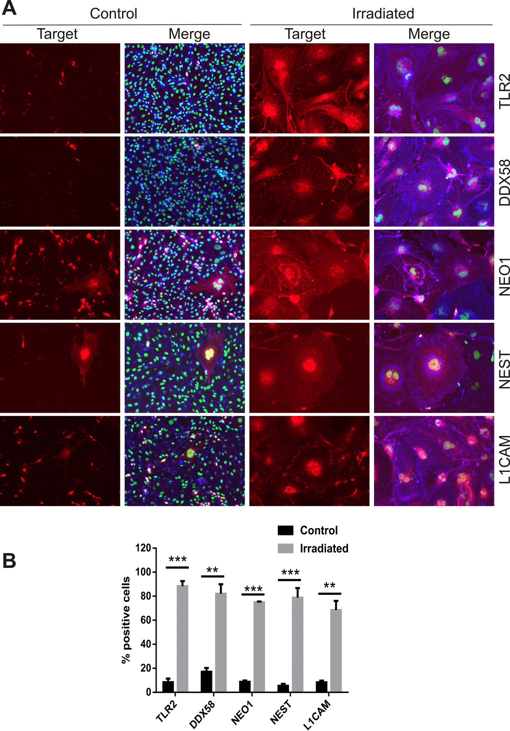 Proteins known to be targets of ADAM10 proteolytic activity, either direct or indirect, were identified as concurrently up-regulated at the cell surface in the proteomic datasets. Neural cell adhesion molecule L1 (L1CAM), Nestin (NEST), Neogenin (NEO1), Toll-like receptor 2 (TLR2) and an ATP-dependent RNA helicase, DDX58 (otherwise known as retinoic acid inducible gene 1 or RIG-1) play key roles in neuroinflammation and innate immune activation [38-40] and were further validated. Immunocytochemical staining of non-permeabilized cells at day 6 post-IR or sham confirmed the increased surface expression of L1CAM, NEST, NEO1, TLR2 and DDX58 in response to radiation (Fig. 5A). The proportion of positively stained cells rose from 5–20% in sham-irradiated cells to 70–90% of the cell population after irradiation (Fig. 5B). In addition, it was noted that hypertrophic, multinucleated senescent-like cells observed sporadically in the sham-irradiated cell populations also demonstrated externalization of these proteins, suggesting surface expression was associated with both replicative and stress-induced senescence (Fig. 5A).