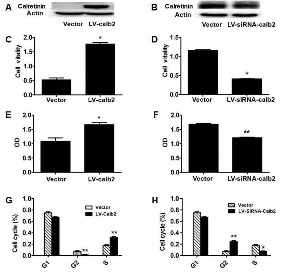 To observe the potential effects of calretinin on testicular Leydig cells, the in vitro cultured MLTC-1 cells were transfected with LV-calb2, and the R2C cells were transfected with LV-siRNA-calb2 for 96 h. Calretinin expression in the MLTC-1 cells transfected with LV-calb2 was significantly increased, while calretinin expression in the R2C cells transfected with LV-siRNA-calb2 was significantly decreased (Figure 1 A and B). When compared with the respective control groups, the viability in the MLTC-1 cells with over-expressed calretinin was significantly higher (Figure 1C, p<0.001), while the viability in the R2C cells with down-regulated calretinin was significantly lower (Figure 1D, p<0.05). Meanwhile, the OD was increased in MLTC-1 cells with up-regulated calretinin expression (Figure 1E, p<0.05) while the OD was decreased in R2C cells with down-regulated calretinin expression (Figure 1F, p<0.05). Interestingly, the number and ratio of cells in the G2 phase of the cell cycle were significantly lower (p<0.01) while the number and ratio of cells in the S phase were significantly higher (Figure 1G, p<0.01) in the MLTC-1 cells with up-regulated calretinin expression. In the R2C cells with down-regulated calretinin, the number and ratio of cells in the G2 phase of the cell cycle were significantly higher (p<0.01) while the ratio of S phase cells was significantly lower (Figure 1H, p<0.05).