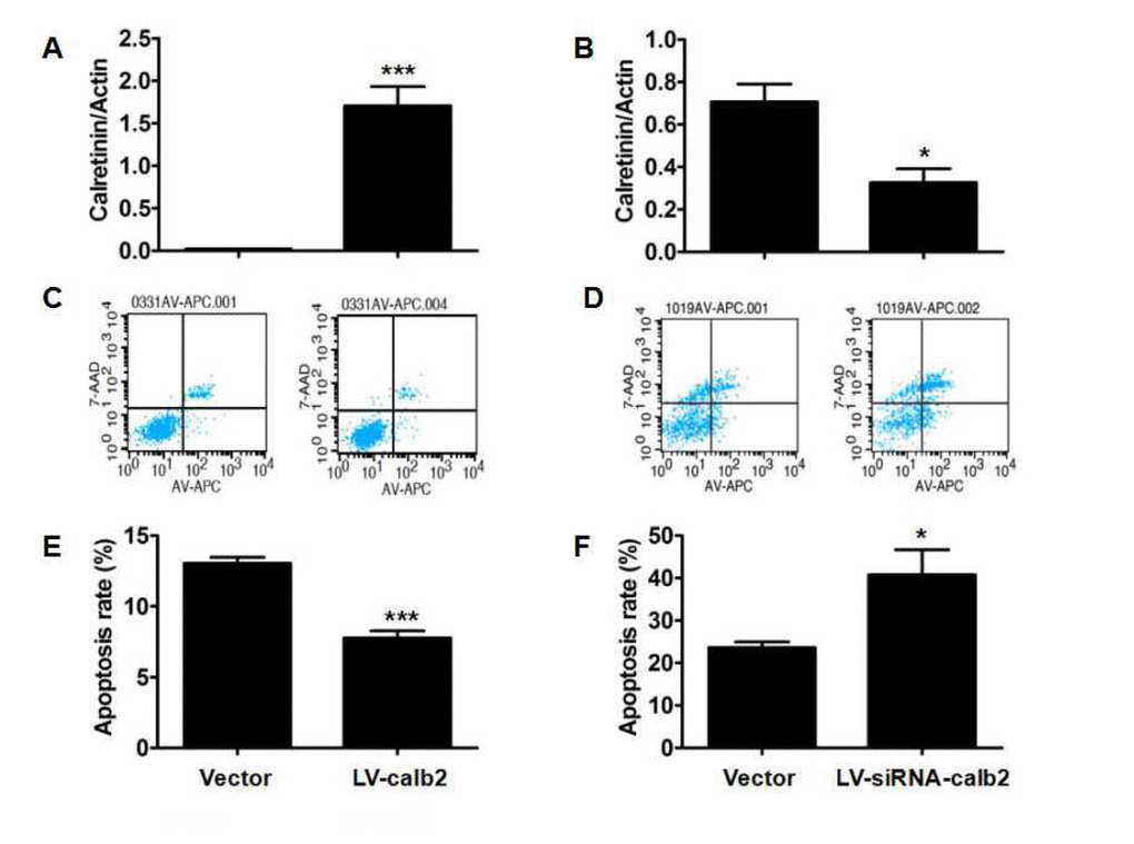 Calretinin expression in the MLTC-1 cells transfected with LV-calb2 and the R2C cells transfected with LV-siRNA-calb2 was analyzed by Western blotting (Figure 3 A and B). The calretinin expression was significantly up-regulated in the MLTC-1 cells transfected with LV-calb2 (p<0.001), while cell apoptosis was decreased and the apoptotic index was significantly lower when compared with the control group (Figure 3C and E, p<0.001). In the R2C cells transfected with LV-siRNA-calb2, the calretinin expression was significantly down-regulated while the apoptotic index was significantly increased (Figure 3D and F, p<0.05).